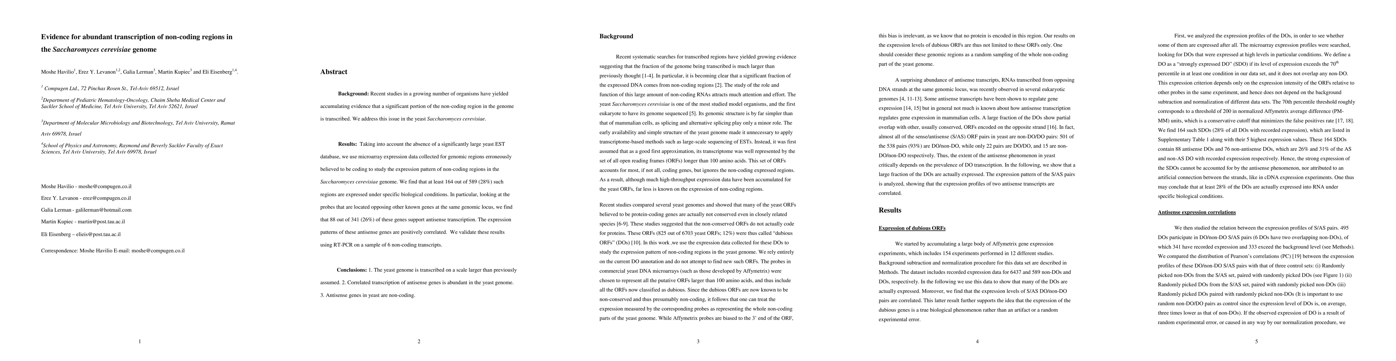 This study reveals that a significant portion of the non-coding regions in the Saccharomyces cerevisiae genome is transcribed, with at least 28% of non-coding regions expressed under specific conditions. Notably, 26% of these regions show antisense transcription, indicating abundant correlated transcription of antisense genes.