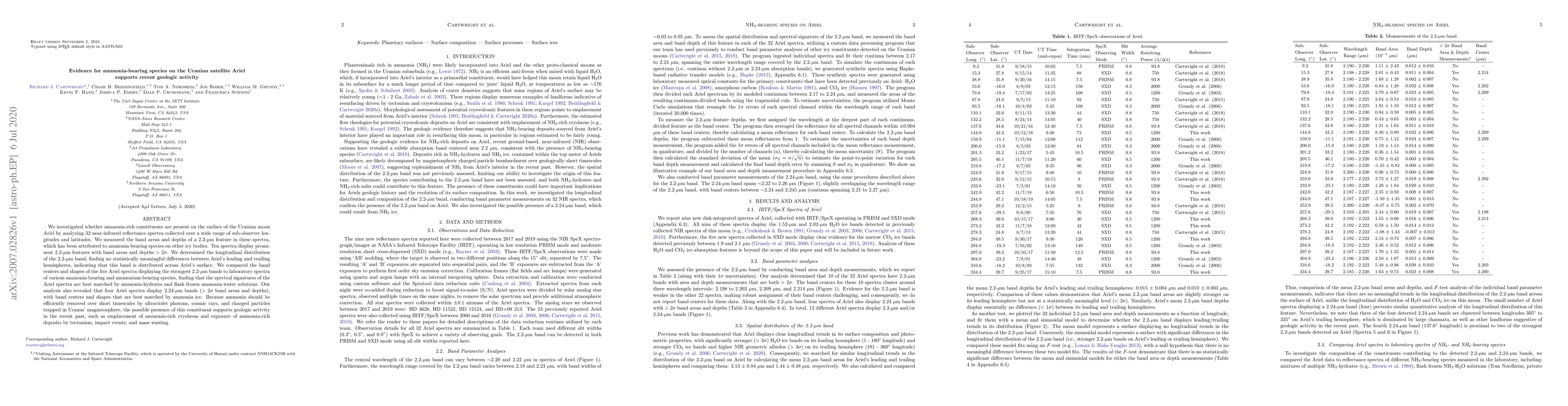 We investigated whether ammonia-rich constituents are present on the surface of the Uranian moon Ariel by analyzing 32 near-infrared reflectance spectra collected over a wide range of sub-observer longitudes and latitudes. We measured the band areas and depths of a 2.2-{\micron} feature in these spectra, which has been attributed to ammonia-bearing species on other icy bodies. Ten spectra display prominent 2.2-{\micron} features with band areas and depths > 2{\sigma}. We determined the longitudinal distribution of the 2.2-{\micron} band, finding no statistically meaningful differences between Ariel's leading and trailing hemispheres, indicating that this band is distributed across Ariel's surface. We compared the band centers and shapes of the five Ariel spectra displaying the strongest 2.2-{\micron} bands to laboratory spectra of various ammonia-bearing and ammonium-bearing species, finding that the spectral signatures of the Ariel spectra are best matched by ammonia-hydrates and flash frozen ammonia-water solutions. Our analysis also revealed that four Ariel spectra display 2.24-{\micron} bands (> 2{\sigma} band areas and depths), with band centers and shapes that are best matched by ammonia ice. Because ammonia should be efficiently removed over short timescales by ultraviolet photons, cosmic rays, and charged particles trapped in Uranus' magnetosphere, the possible presence of this constituent supports geologic activity in the recent past, such as emplacement of ammonia-rich cryolavas and exposure of ammonia-rich deposits by tectonism, impact events, and mass wasting.