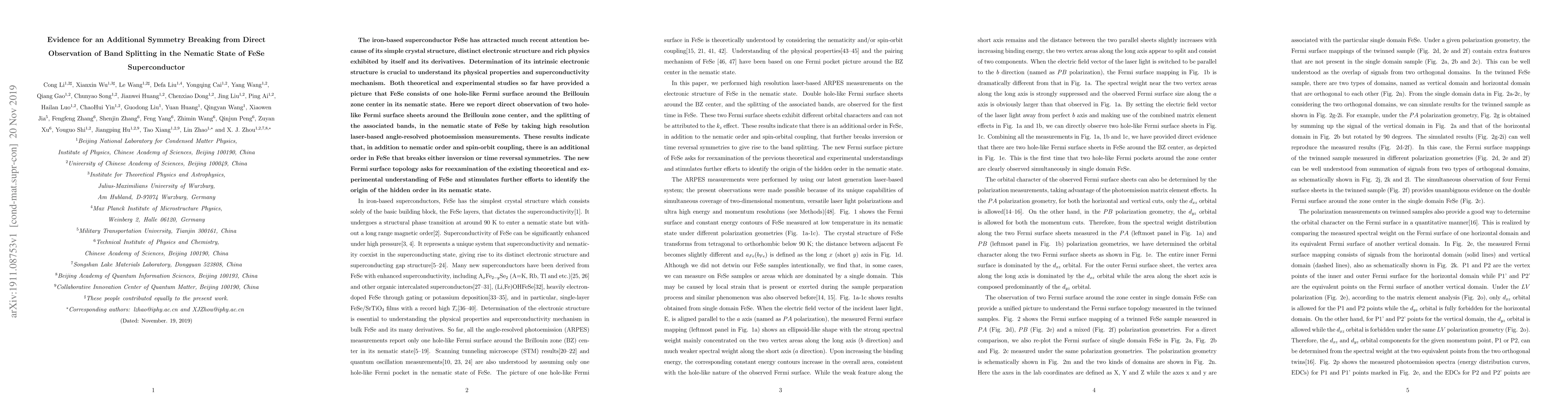 This study reports the direct observation of two hole-like Fermi surface sheets and band splitting in FeSe's nematic state using high-resolution laser-based angle-resolved photoemission spectroscopy, revealing an additional symmetry breaking beyond nematic order and spin-orbit coupling. This new Fermi surface topology challenges existing theories and calls for a reevaluation of FeSe's superconductivity mechanism.