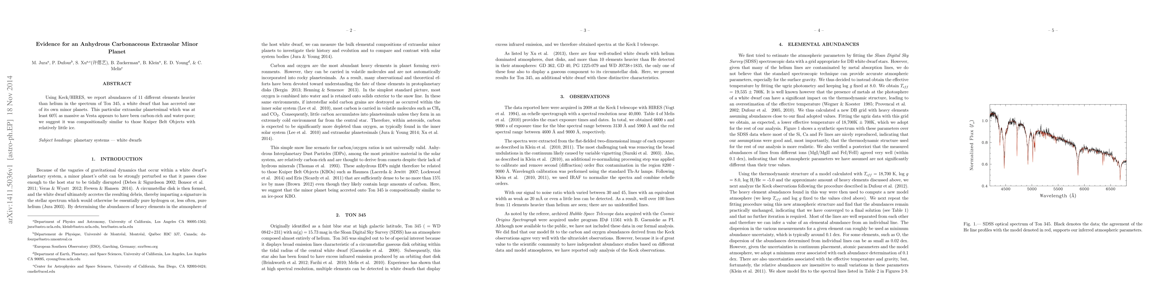 This study, using Keck/HIRES, reveals the composition of an accreted minor planet by analyzing the spectrum of the white dwarf Ton 345, indicating it was carbon-rich and water-poor, suggesting a composition similar to anhydrous Kuiper Belt Objects.