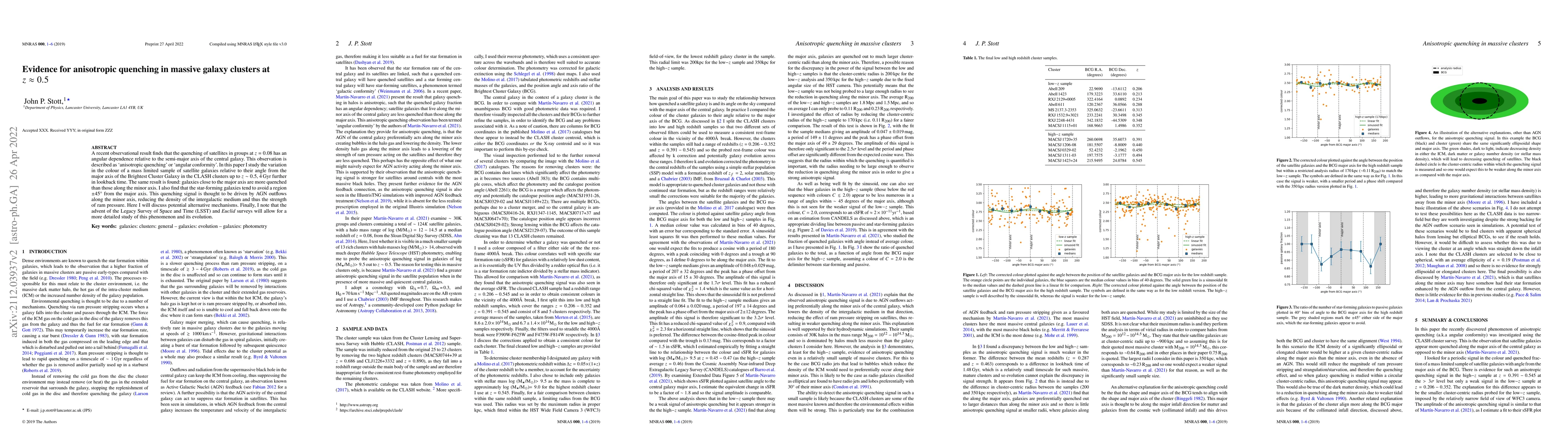 A recent observational result finds that the quenching of satellites in groups at $z=0.08$ has an angular dependence relative to the semi-major axis of the central galaxy. This observation is described as `anisotropic quenching' or `angular conformity'. In this paper I study the variation in the colour of a mass limited sample of satellite galaxies relative to their angle from the major axis of the Brightest Cluster Galaxy in the CLASH clusters up to $z\sim0.5$, 4 Gyr further in lookback time. The same result is found: galaxies close to the major axis are more quenched than those along the minor axis. I also find that the star-forming galaxies tend to avoid a region +/-45 degrees from the major axis. This quenching signal is thought to be driven by AGN outflows along the minor axis, reducing the density of the intergalactic medium and thus the strength of ram pressure. Here I will discuss potential alternative mechanisms. Finally, I note that the advent of the Legacy Survey of Space and Time (LSST) and Euclid surveys will allow for a more detailed study of this phenomenon and its evolution.