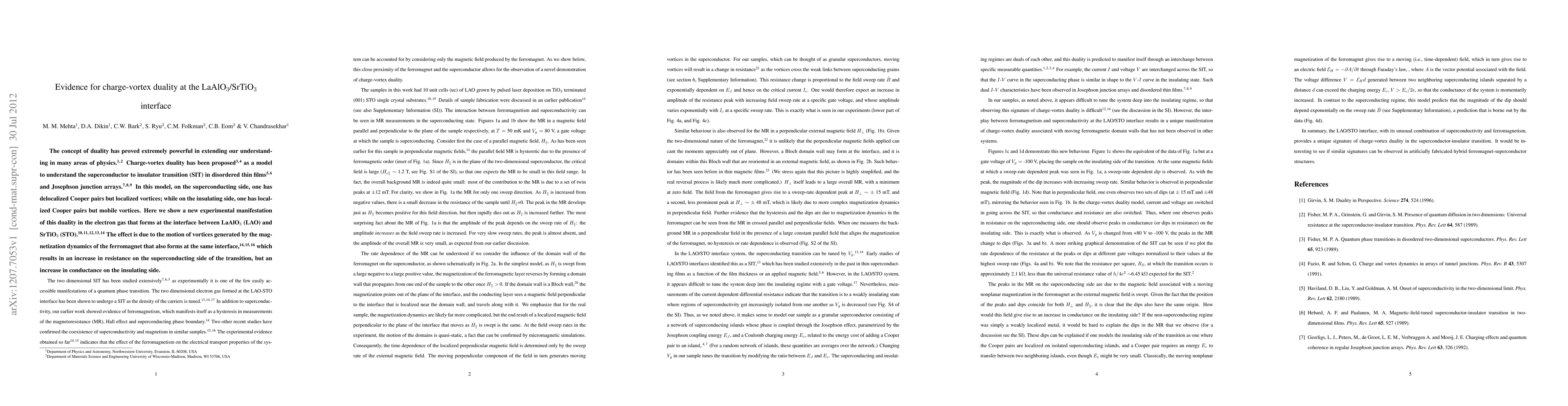 Researchers observe charge-vortex duality at LaAlO$_3$/SrTiO$_3$ interface, where vortices generated by magnetization dynamics increase resistance on superconducting side and conductance on insulating side.