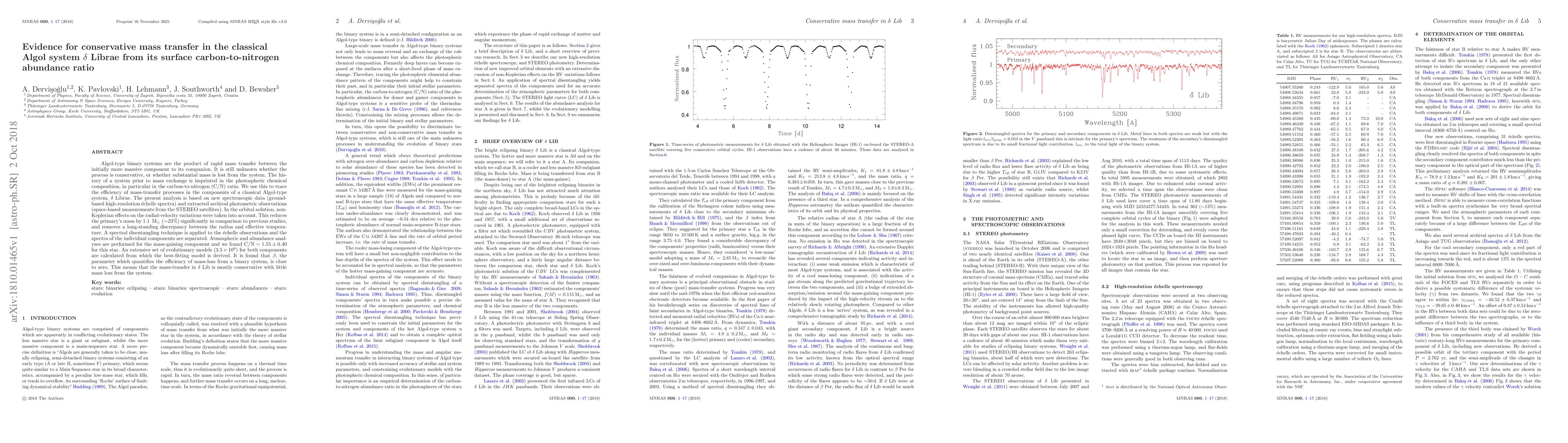 Algol-type binary systems are the product of rapid mass transfer between the initially more massive component to its companion. It is still unknown whether the process is conservative, or whether substantial mass is lost from the system. The history of a system prior to mass exchange is imprinted in the photospheric chemical composition, in particular in the carbon-to-nitrogen (C/N) ratio. We use this to trace the efficiency of mass-transfer processes in the components of a classical Algol-type system, $\delta$ Librae. The present analysis is based on new spectroscopic data (ground-based high-resolution \'echelle spectra) and extracted archival photometric observations (space-based measurements from the STEREO satellites). In the orbital solution, non-Keplerian effects on the radial-velocity variations were taken into account. This reduces the primary's mass by 1.1 \Msun\ ($\sim$23\%) significantly in comparison to previous studies, and removes a long-standing discrepancy between the radius and effective temperature. A spectral disentangling technique is applied to the \'echelle observations and the spectra of the individual components are separated. Atmospheric and abundance analyses are performed for the mass-gaining component and we found C/N $= 1.55 \pm 0.40$ for this star. An extensive set of evolutionary models ($3.5\times10^6$) for both components are calculated from which the best-fitting model is derived. It is found that $\beta$, the parameter which quantifies the efficiency of mass-loss from a binary system, is close to zero. This means that the mass-transfer in $\delta$ Lib is mostly conservative with little mass loss from the system.