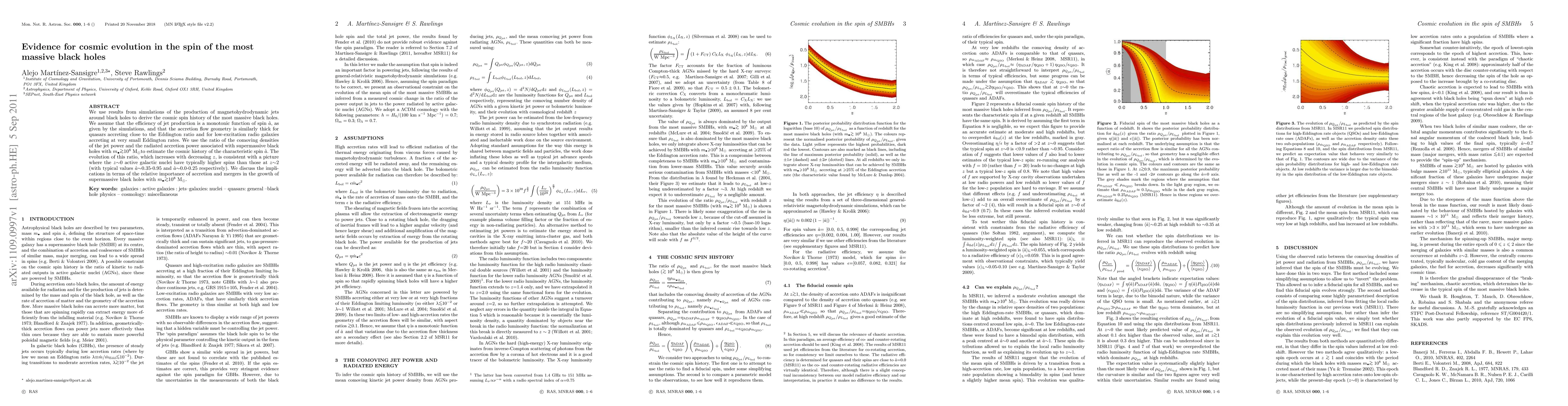 This paper uses simulations of magnetohydrodynamic jets around black holes to determine the cosmic spin history of the most massive black holes, finding that present-day active galactic nuclei typically have higher spins than those from two billion years ago. The study suggests that accretion and mergers play different roles in the growth of supermassive black holes.