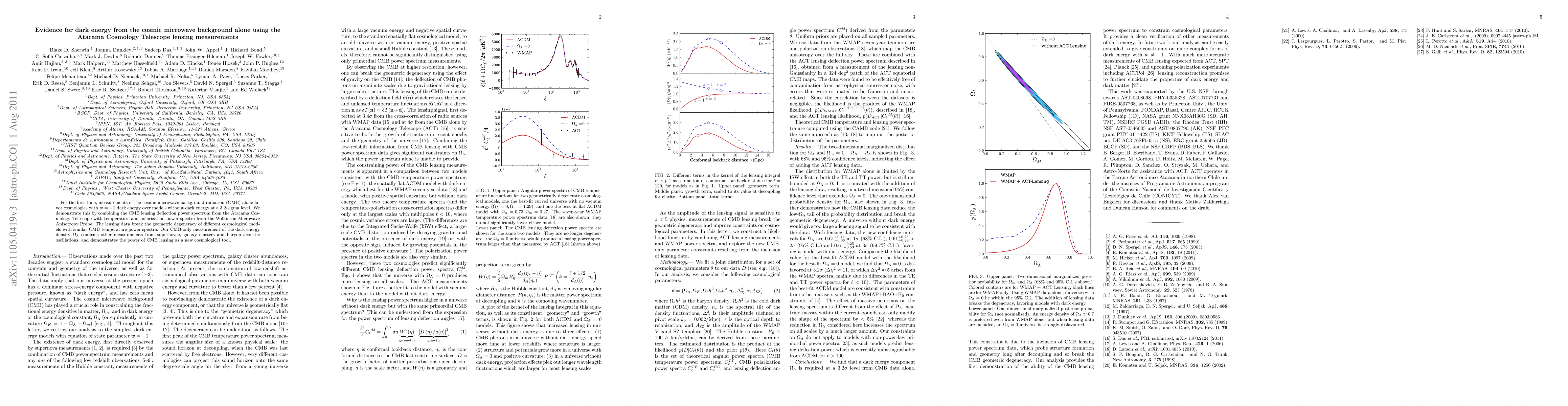 This paper demonstrates that cosmic microwave background (CMB) radiation measurements alone, specifically using the Atacama Cosmology Telescope's lensing data, provide evidence for dark energy at a 3.2-sigma level, favoring models with $w=-1$ dark energy over those without. The CMB lensing data break model degeneracies, confirming the dark energy density and highlighting CMB lensing as a powerful new tool in cosmology.