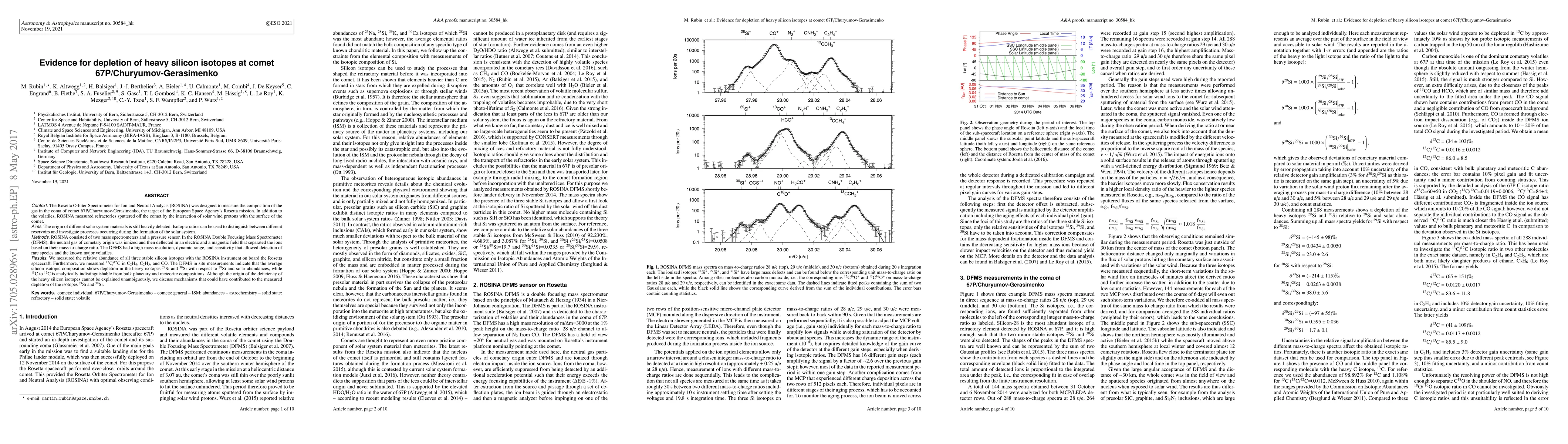 Context. The Rosetta Orbiter Spectrometer for Ion and Neutral Analysis (ROSINA) was designed to measure the composition of the gas in the coma of comet 67P/Churyumov-Gerasimenko, the target of the European Space Agency's Rosetta mission. In addition to the volatiles, ROSINA measured refractories sputtered off the comet by the interaction of solar wind protons with the surface of the comet. Aims. The origin of different solar system materials is still heavily debated. Isotopic ratios can be used to distinguish between different reservoirs and investigate processes occurring during the formation of the solar system. Methods. ROSINA consisted of two mass spectrometers and a pressure sensor. In the ROSINA Double Focusing Mass Spectrometer (DFMS), the neutral gas of cometary origin was ionized and then deflected in an electric and a magnetic field that separated the ions based on their mass-to-charge ratio. The DFMS had a high mass resolution, dynamic range, and sensitivity that allowed detection of rare species and the known major volatiles. Results. We measured the relative abundance of all three stable silicon isotopes with the ROSINA instrument on board the Rosetta spacecraft. Furthermore, we measured $^{13}$C/$^{12}$C in C$_2$H$_4$, C$_2$H$_5$, and CO. The DFMS in situ measurements indicate that the average silicon isotopic composition shows depletion in the heavy isotopes $^{29}$Si and $^{30}$Si with respect to $^{28}$Si and solar abundances, while $^{13}$C to $^{12}$C is analytically indistinguishable from bulk planetary and meteorite compositions. Although the origin of the deficiency of the heavy silicon isotopes cannot be explained unambiguously, we discuss mechanisms that could have contributed to the measured depletion of the isotopes $^{29}$Si and $^{30}$Si.
