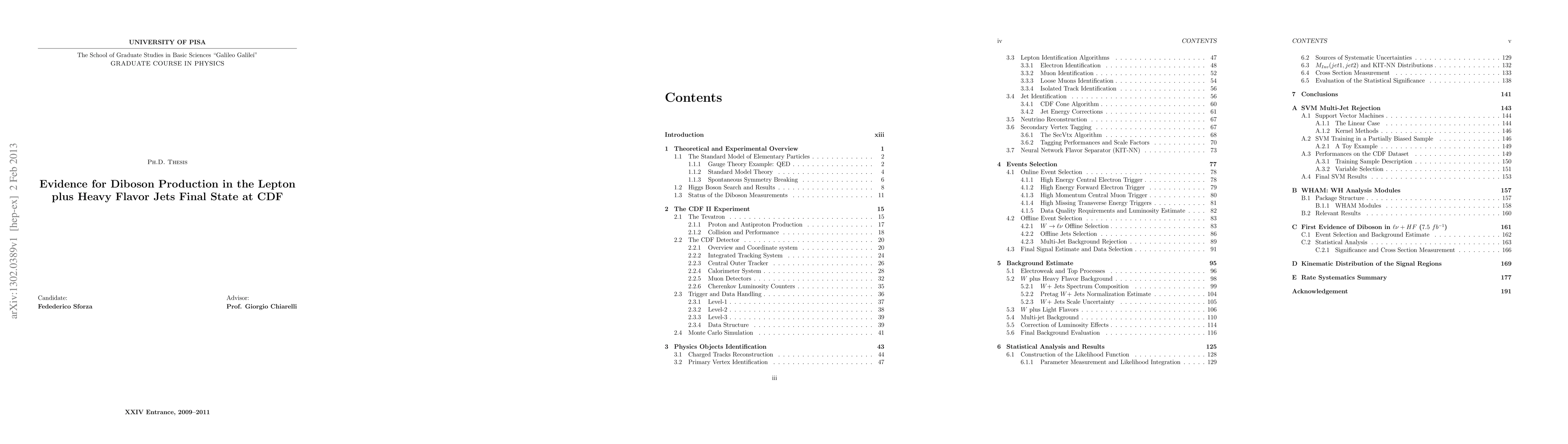 This thesis presents the evidence, at 3.08 sigma, for the associate production of massive vector bosons (W and Z) in a final state with one lepton, MET and HF-tagged jets, measured with the complete CDF II dataset (9.4fb^-1 of data). The signals, both inclusive diboson production and WW vs WZ/ZZ separately, were extracted from the invariant mass distribution, M_inv(jet1,jet2), of single and double HF-tagged jet pairs. For single-tagged events the b quark vs c quark discrimination was obtained by using a bi-dimensional distribution M_inv(jet1,jet2) vs a flavor-serapator NN. The results, consistent with the SM prediction, confirm the CDF capability of identify a small signal in this challenging final state. In particular we also report the previous version of this analysis, performed with a dataset of 7.5fb^-1 that was the first evidence of diboson production in lnu+HF final state at a hadron collider. Beyond the pure testing of SM predicted processes, several of the techniques developed for this thesis were also applied to the WH search at CDF, with a relevant improvement of the sensitivity to this process.