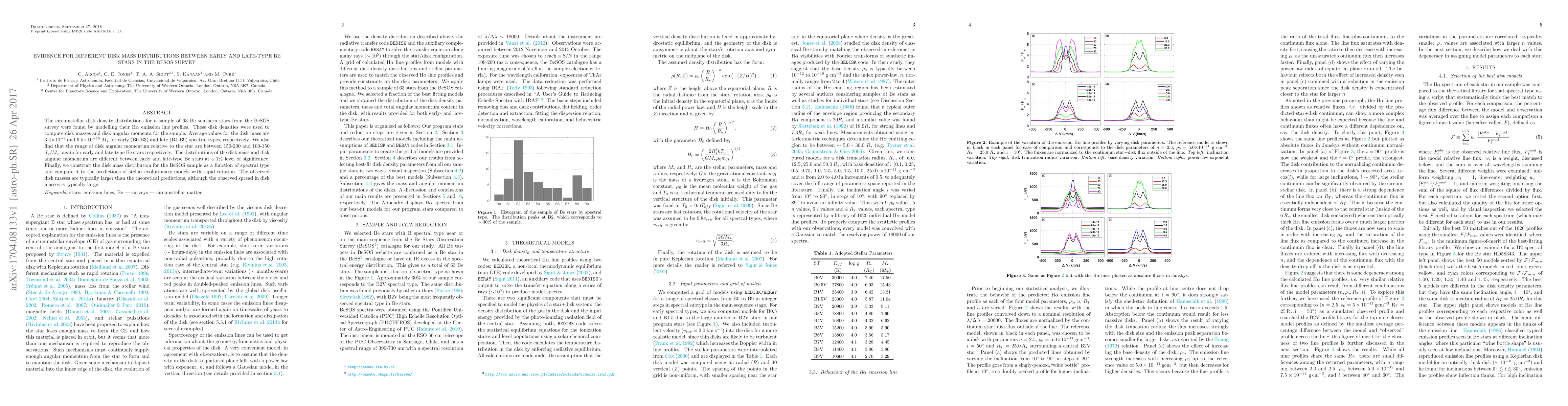 The circumstellar disk density distributions for a sample of 63 Be southern stars from the BeSOS survey were found by modelling their H$\alpha$ emission line profiles. These disk densities were used to compute disk masses and disk angular momenta for the sample. Average values for the disk mass are 3.4$\times$10$^{-9}$ and 9.5$\times$10$^{-10}$ $M_{\star}$ for early (B0-B3) and late (B4-B9) spectral types, respectively. We also find that the range of disk angular momentum relative to the star are between 150-200 and 100-150 $J_{\star}/M_{\star}$, again for early and late-type Be stars respectively. The distributions of the disk mass and disk angular momentum are different between early and late-type Be stars at a 1\% level of significance. Finally, we construct the disk mass distribution for the BeSOS sample as a function of spectral type and compare it to the predictions of stellar evolutionary models with rapid rotation. The observed disk masses are typically larger than the theoretical predictions, although the observed spread in disk masses is typically large.