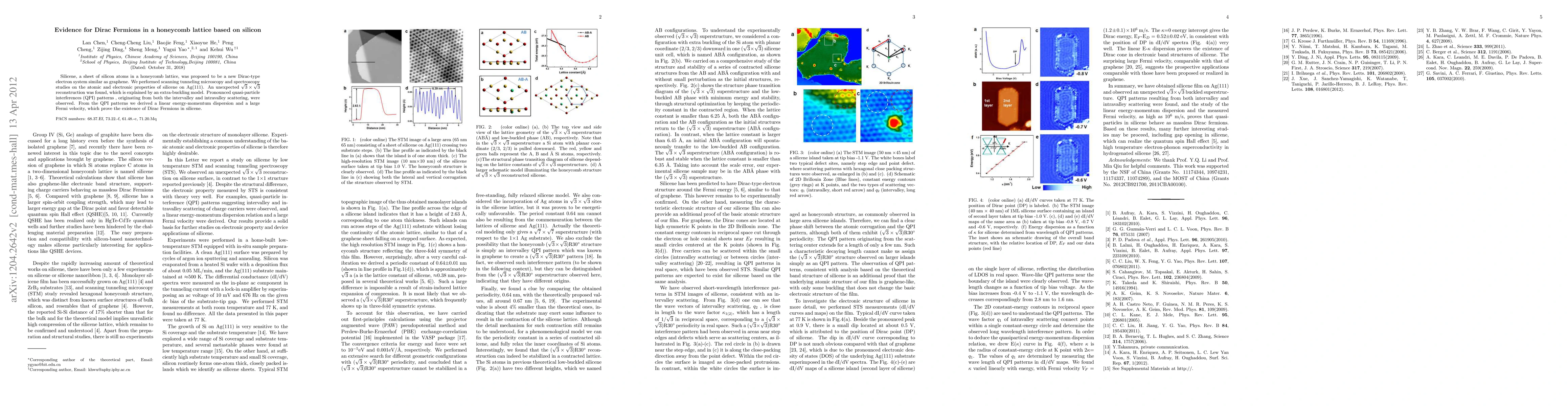 The study reveals the presence of Dirac fermions in silicene, a silicon honeycomb lattice, through scanning tunneling microscopy and spectroscopy, identifying linear energy-momentum dispersion and large Fermi velocity, confirming its Dirac-type electron system. The observed $\sqrt{3}\times \sqrt{3}$ reconstruction is explained by an extra-buckling model.