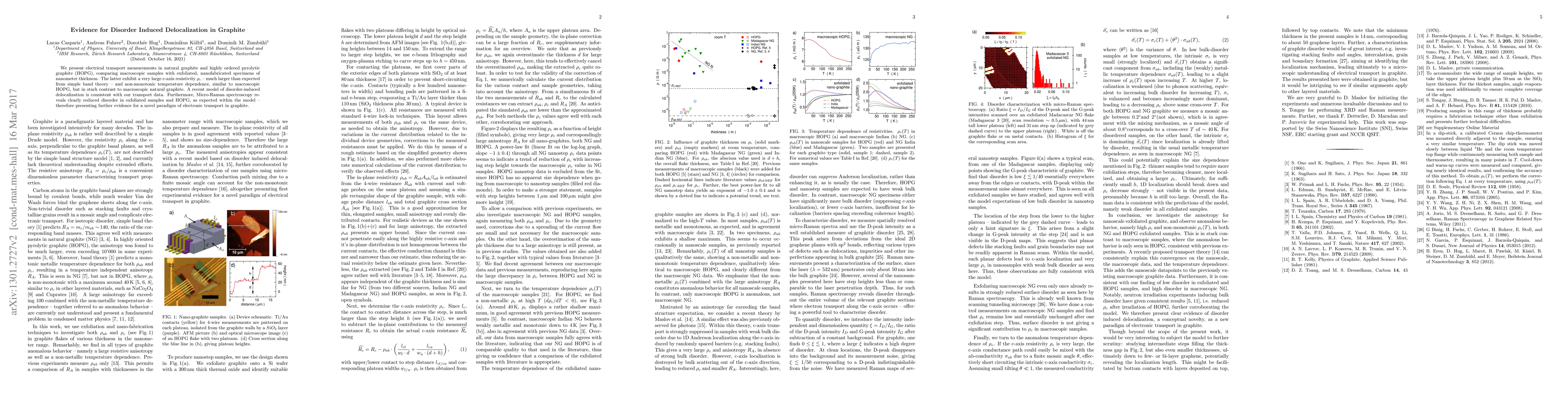 This paper reports on electrical transport measurements in graphite, showing that nanofabricated samples exhibit significantly higher c-axis resistivity and non-monotonic temperature dependence compared to macroscopic samples, supporting a model of disorder-induced delocalization. Micro-Raman spectroscopy confirms reduced disorder in these samples, providing further evidence for this new paradigm of electronic transport in graphite.