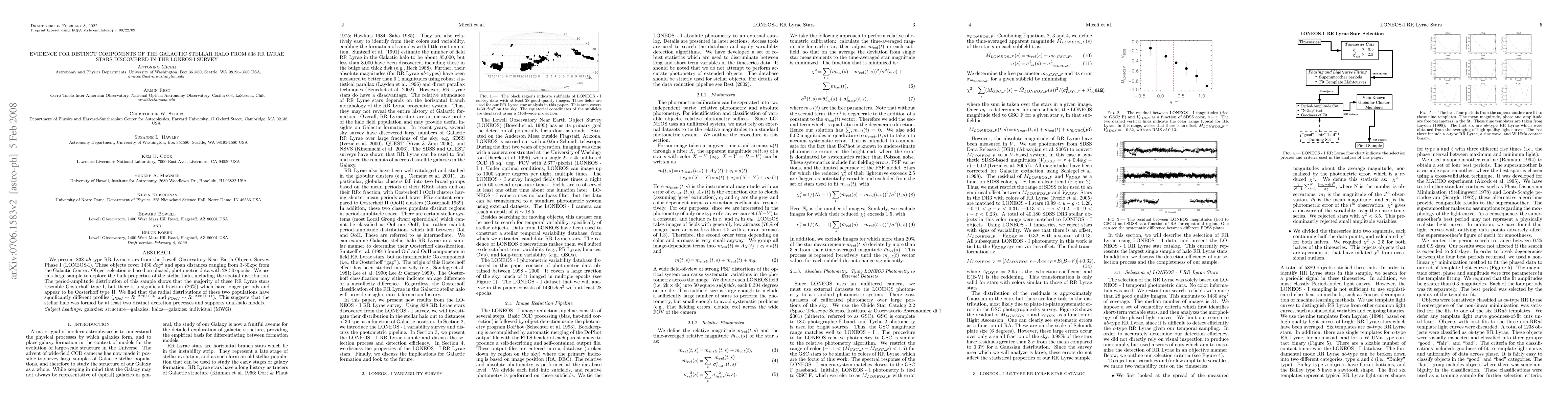 We present 838 ab-type RR Lyrae stars from the Lowell Observatory Near Earth Objects Survey Phase I (LONEOS-I). These objects cover 1430 deg^2 and span distances ranging from 3-30 kpc from the Galactic Center. Object selection is based on phased, photometric data with 28-50 epochs. We use this large sample to explore the bulk properties of the stellar halo, including the spatial distribution. The period-amplitude distribution of this sample shows that the majority of these RR Lyrae stars resemble Oosterhoff type I, but there is a significant fraction (26 %) which have longer periods and appear to be Oosterhoff type II. We find that the radial distributions of these two populations have significantly different profiles (rho_{OoI} ~ R^(-2.26 +- 0.07) and rho_{OoII} ~ R^(-2.88 +- 0.11). This suggests that the stellar halo was formed by at least two distinct accretion processes and supports dual-halo models.