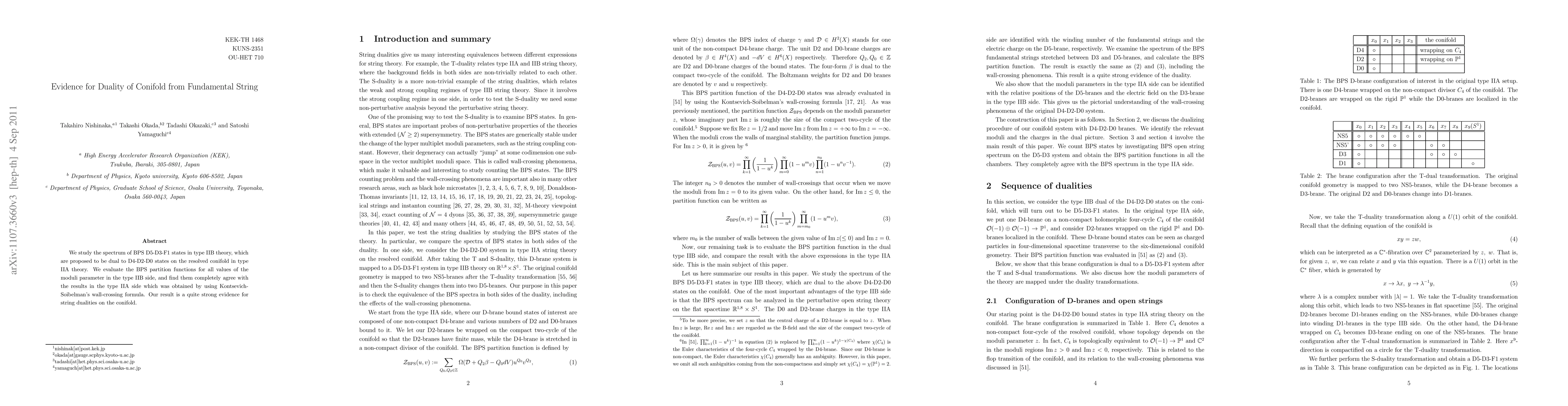 Researchers studied string dualities on the conifold in type IIB and type IIA theories, finding strong agreement between BPS partition functions, providing evidence for the duality of the conifold.