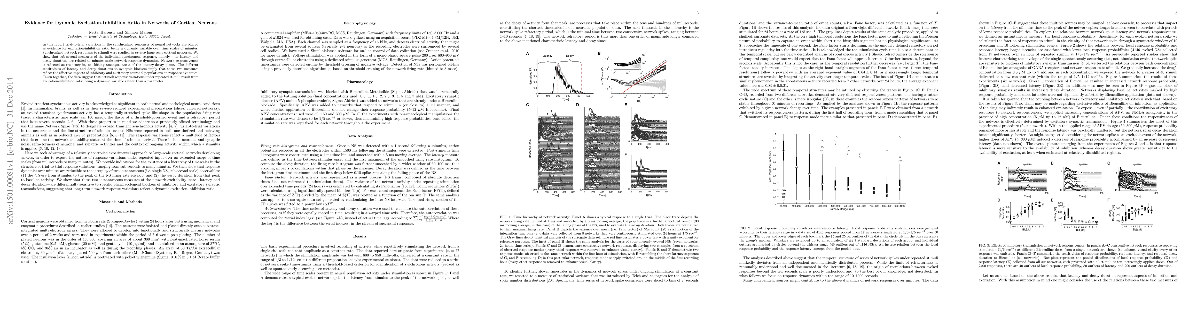 This study demonstrates that the excitation-inhibition ratio in cortical neuron networks is dynamic over minutes, evidenced by trial-to-trial variations in synchronized responses. The latency and decay duration of these responses reflect the changing balance between excitatory and inhibitory influences, suggesting that network responsiveness shifts over time.