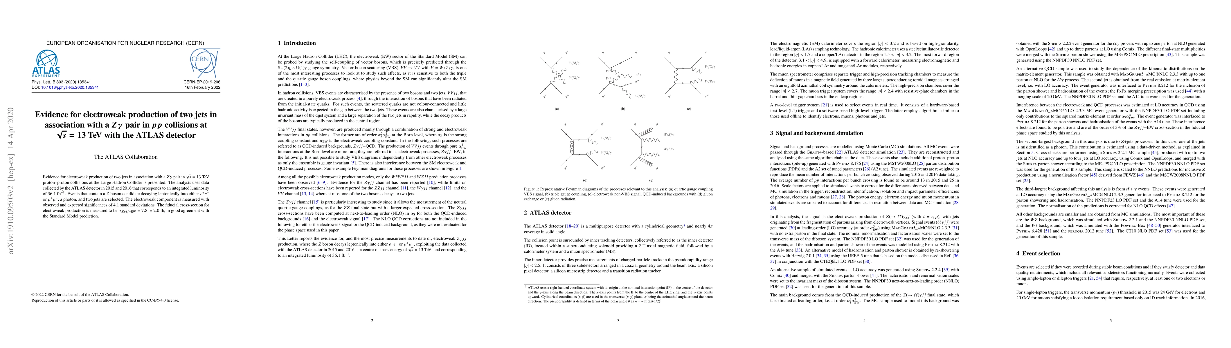 This paper presents evidence for electroweak production of two jets with a $Z\gamma$ pair in $pp$ collisions at $\sqrt{s} = 13$ TeV using the ATLAS detector. The analysis confirms this process with a significance of $4.1$ standard deviations and measures a fiducial cross-section of $7.8 \pm 2.0$ fb, consistent with Standard Model predictions.