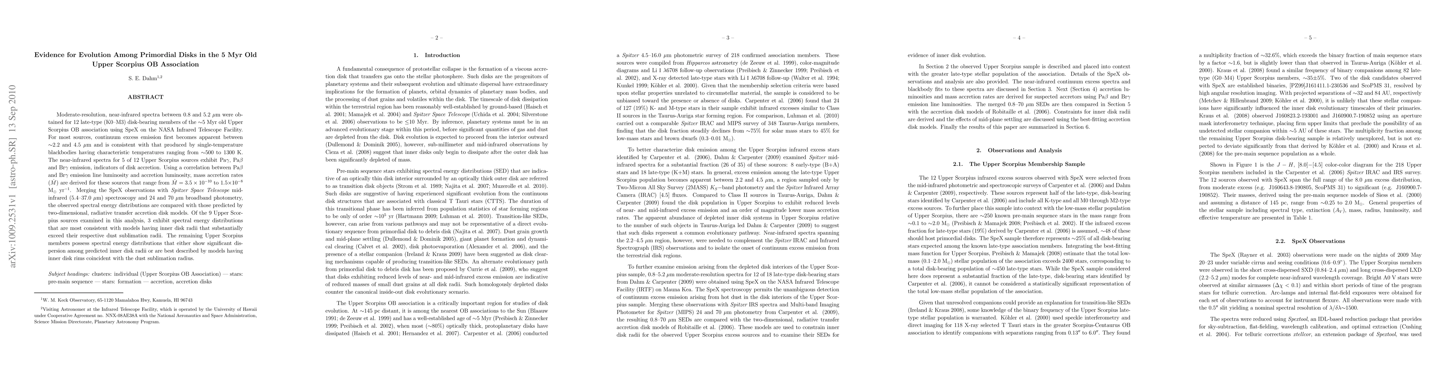 This study analyzes near-infrared spectra of 12 disk-bearing stars in the Upper Scorpius OB association, revealing evidence of disk accretion and varying mass accretion rates. The spectral energy distributions suggest that some disks have inner radii larger than their dust sublimation radii, indicating evolutionary stages in the primordial disks.