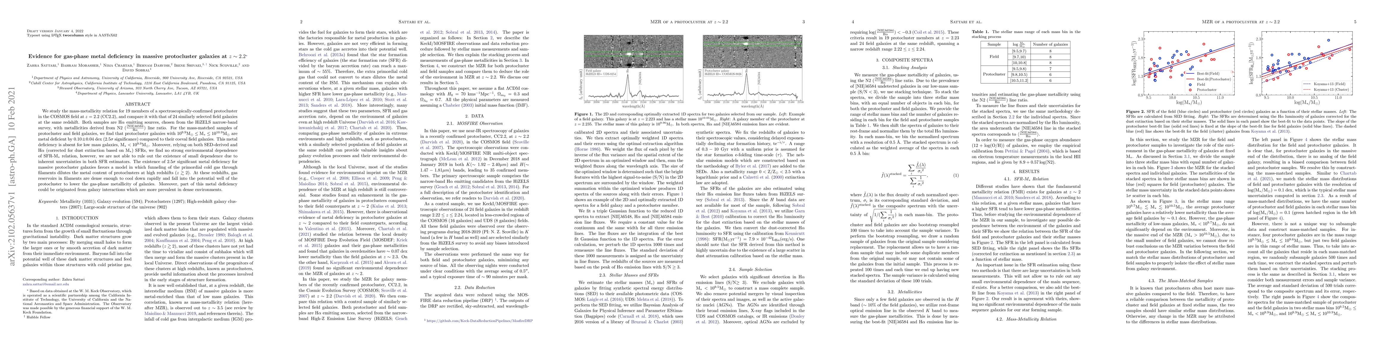 We study the mass-metallicity relation for 19 members of a spectroscopically-confirmed protocluster in the COSMOS field at $z=2.2$ (CC2.2), and compare it with that of 24 similarly selected field galaxies at the same redshift. Both samples are $\rm H\alpha$ emitting sources, chosen from the HiZELS narrow-band survey, with metallicities derived from $\rm N2\ (\frac{\rm [NII] \lambda 6584}{\rm H \alpha})$ line ratio. For the mass-matched samples of protocluster and field galaxies, we find that protocluster galaxies with $10^{9.9} \rm M_\odot \leq M_* \leq 10^{10.9} \rm M_\odot$ are metal deficient by $0.10 \pm 0.04$ dex ($2.5\sigma$ significance) compared to their coeval field galaxies. This metal deficiency is absent for low mass galaxies, $\rm M_* < 10^{9.9} \rm M_\odot$. Moreover, relying on both SED-derived and $\rm {H\alpha}$ (corrected for dust extinction based on $\rm {M_*}$) SFRs, we find no strong environmental dependence of SFR-$\rm {M_*}$ relation, however, we are not able to rule out the existence of small dependence due to inherent uncertainties in both SFR estimators. The existence of $2.5\sigma$ significant metal deficiency for massive protocluster galaxies favors a model in which funneling of the primordial cold gas through filaments dilutes the metal content of protoclusters at high redshifts ($z \gtrsim 2$). At these redshifts, gas reservoirs in filaments are dense enough to cool down rapidly and fall into the potential well of the protocluster to lower the gas-phase metallicity of galaxies. Moreover, part of this metal deficiency could be originated from galaxy interactions which are more prevalent in dense environments.