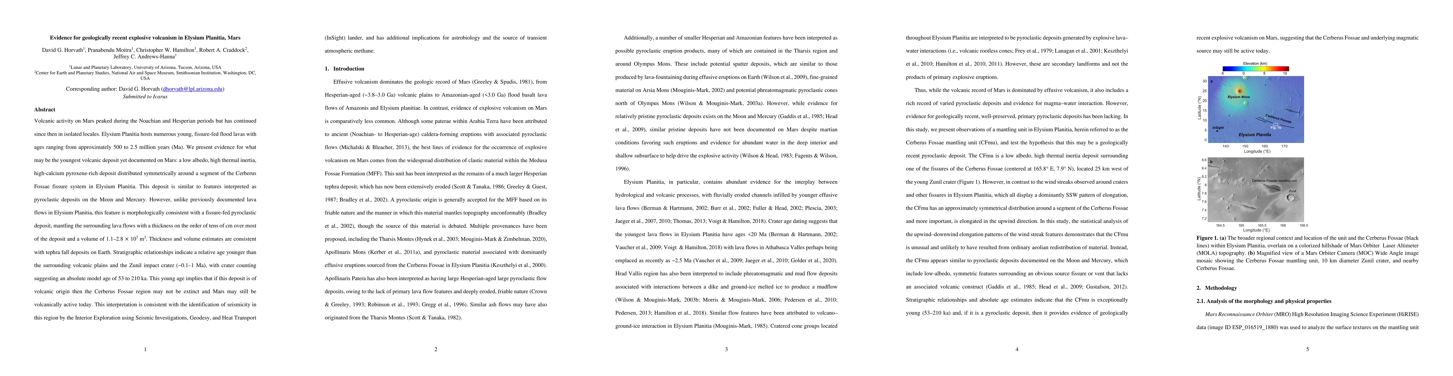 This paper presents evidence for a geologically recent volcanic deposit in Elysium Planitia, Mars, suggesting activity as young as 53 to 210 ka. The deposit, characterized by pyroclastic morphology and high thermal inertia, indicates ongoing volcanic activity in the Cerberus Fossae region, with implications for Mars' current geological state and potential for life.