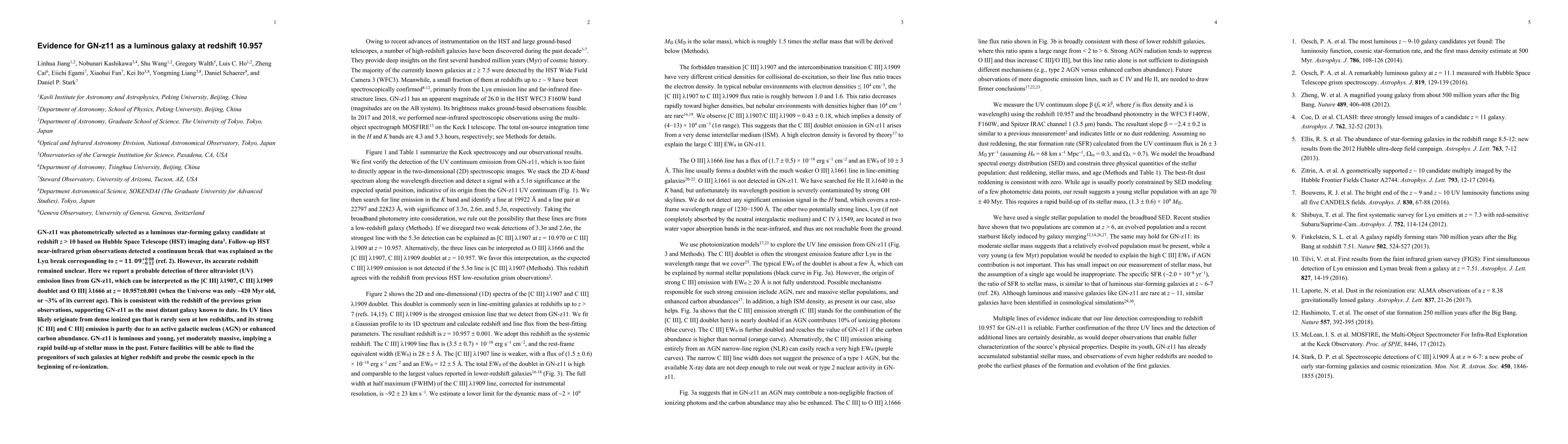 GN-z11 is confirmed as the most distant galaxy known at redshift 10.957 through detection of ultraviolet emission lines, indicating rapid star formation and possibly an active galactic nucleus. This supports its status as a luminous galaxy from when the universe was only ~420 million years old.