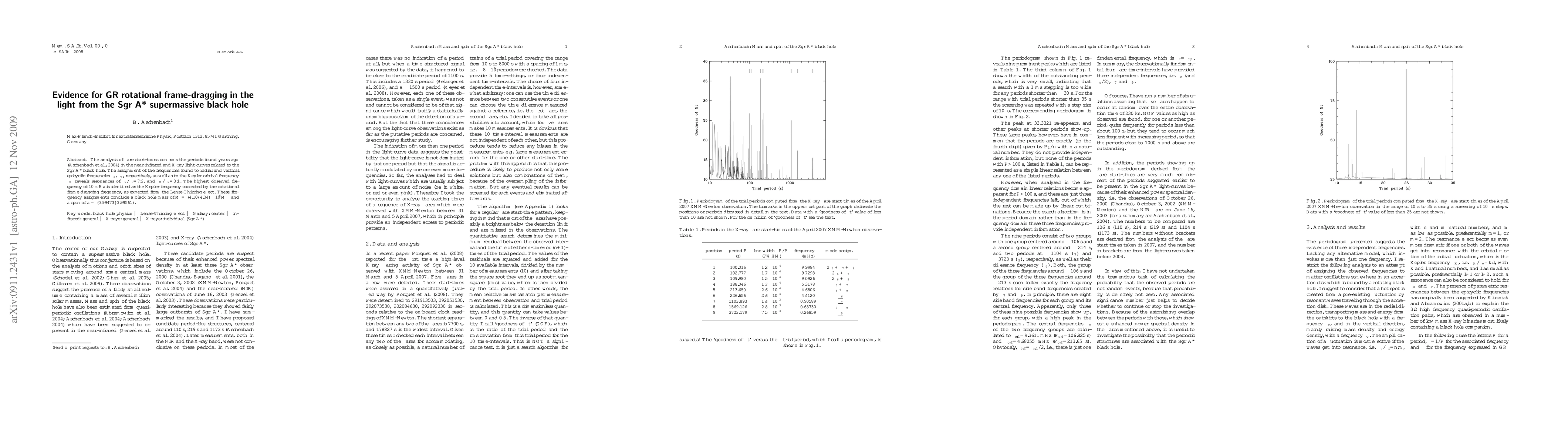 The analysis of flare start-times confirms the periods found years ago (Aschenbach et al., 2004) in the near-infrared and X-ray light-curves related to the Sgr A* black hole. The assignment of the frequencies found to radial and vertical epicyclic frequencies $\nu\sb{\rm r}$, $\nu\sb{\rm v}$, respectively, as well as to the Kepler orbital frequency $\nu\sb{\rm K}$ reveals resonances of $\nu\sb{\rm v}$ / $\nu\sb{\rm r}$=7:2, and $\nu\sb{\rm K}$ / $\nu\sb{\rm v}$=3:1. The highest observed frequency of 10 mHz is identified as the Kepler frequency corrected by the rotational frame-dragging frequency, as expected from the Lense-Thirring effect. These frequency assignments conclude a black hole mass of M = (4.10-4.34)$\times10\sp{6} M_\odot$ and a spin of a = (0.99473-0.99561).