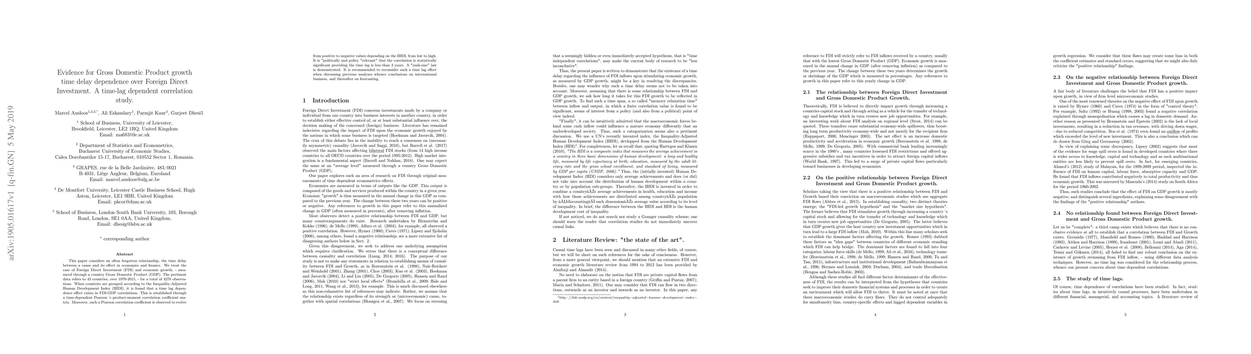 This paper considers an often forgotten relationship, the time delay between a cause and its effect in economies and finance. We treat the case of Foreign Direct Investment (FDI) and economic growth, - measured through a country Gross Domestic Product (GDP). The pertinent data refers to 43 countries, over 1970-2015, - for a total of 4278 observations. When countries are grouped according to the Inequality-Adjusted Human Development Index (IHDI), it is found that a time lag dependence effect exists in FDI-GDP correlations. This is established through a time-dependent Pearson 's product-moment correlation coefficient matrix. Moreover, such a Pearson correlation coefficient is observed to evolve from positive to negative values depending on the IHDI, from low to high. It is "politically and policy "relevant" that the correlation is statistically significant providing the time lag is less than 3 years. A "rank-size" law is demonstrated. It is recommended to reconsider such a time lag effect when discussing previous analyses whence conclusions on international business, and thereafter on forecasting.