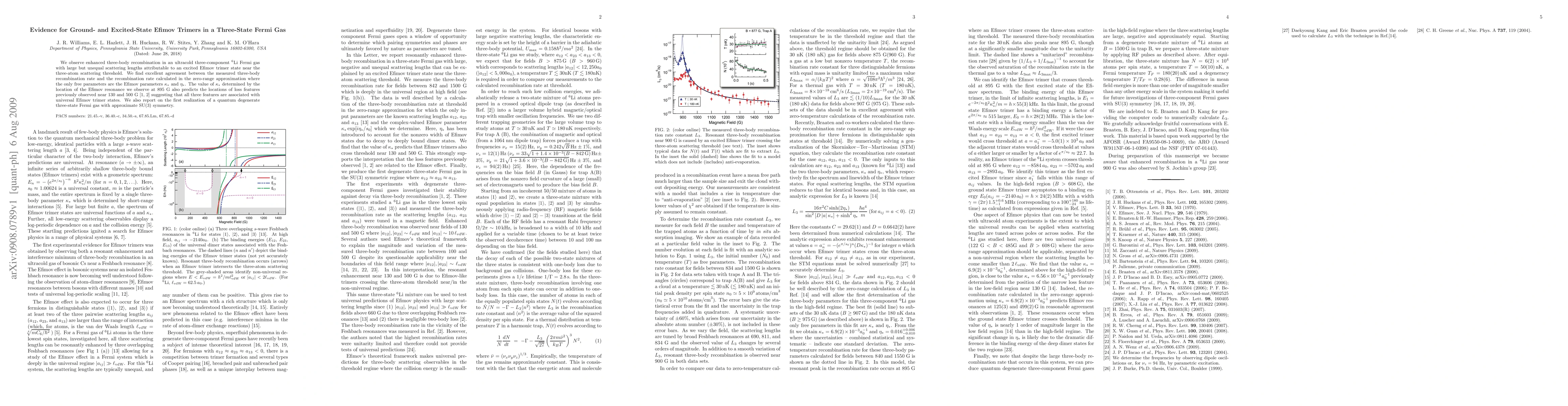 We observe enhanced three-body recombination in an ultracold three-component $^6$Li Fermi gas with large but unequal scattering lengths attributable to an excited Efimov trimer state near the three-atom scattering threshold. We find excellent agreement between the measured three-body recombination rate and the recombination rate calculated in the zero-range approximation where the only free parameters are the Efimov parameters $\kappa_*$ and $\eta_*$. The value of $\kappa_*$ determined by the location of the Efimov resonance we observe at 895 G also predicts the locations of loss features previously observed near 130 and 500 G \cite{Jochim08,OHara09} suggesting that all three features are associated with universal Efimov trimer states. We also report on the first realization of a quantum degenerate three-state Fermi gas with approximate SU(3) symmetry.