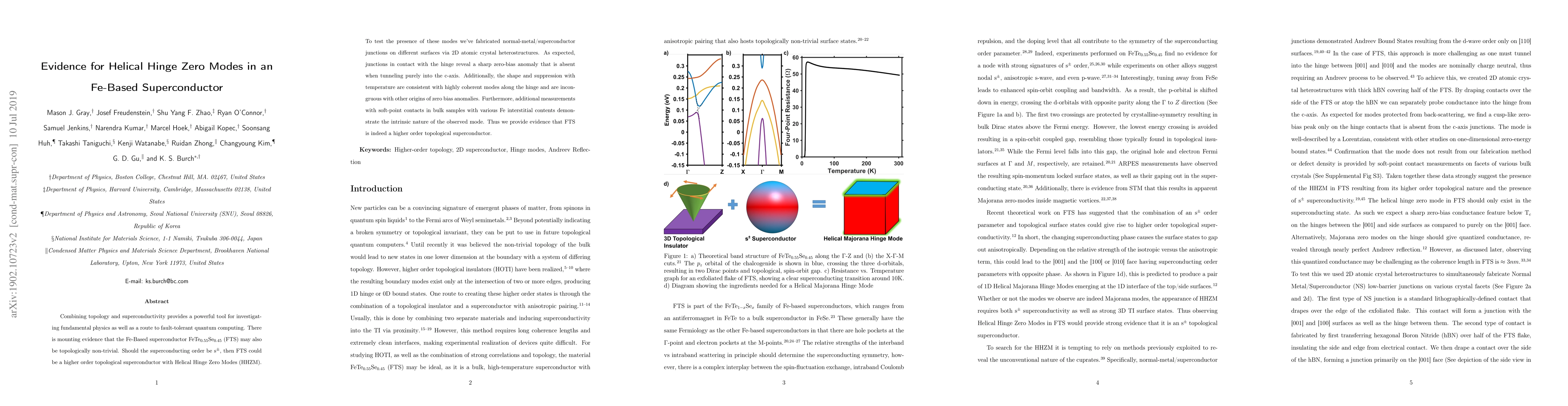This paper provides evidence for Helical Hinge Zero Modes (HHZM) in the Fe-based superconductor FeTe$_{0.55}$Se$_{0.45}$ (FTS), suggesting it is a higher order topological superconductor. The study developed a new method for making normal metal/superconductor junctions in 2D atomic crystal heterostructures, revealing a sharp zero-bias anomaly consistent with HHZM, which is intrinsic and not observed in c-axis tunneling.