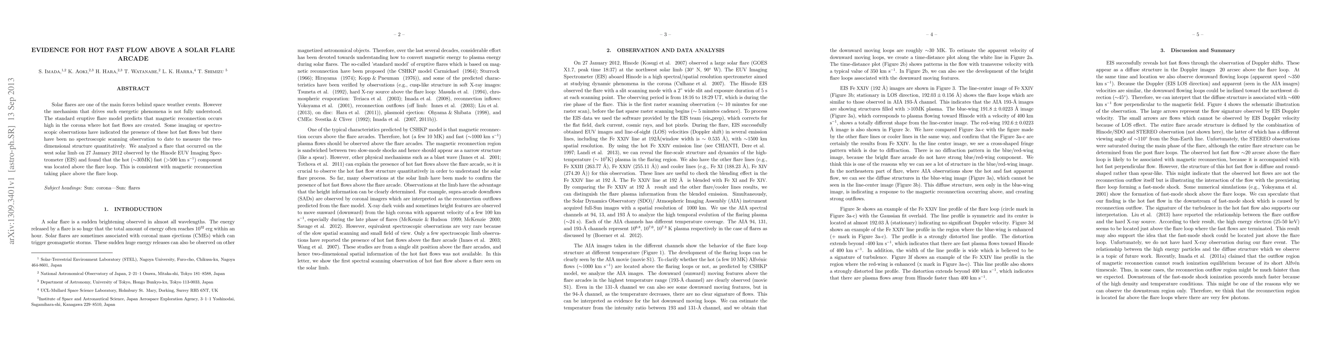 Solar flares are one of the main forces behind space weather events. However the mechanism that drives such energetic phenomena is not fully understood. The standard eruptive flare model predicts that magnetic reconnection occurs high in the corona where hot fast flows are created. Some imaging or spectroscopic observations have indicated the presence of these hot fast flows but there have been no spectroscopic scanning observation to date to measure the two-dimensional structure quantitatively. We analyzed a flare that occurred on the west solar limb on 27 January 2012 observed by the Hinode EUV Imaging Spectrometer (EIS) and found that the hot (~30MK) fast (>500 km/s) component was located above the flare loop. This is consistent with magnetic reconnection taking place above the flare loop.