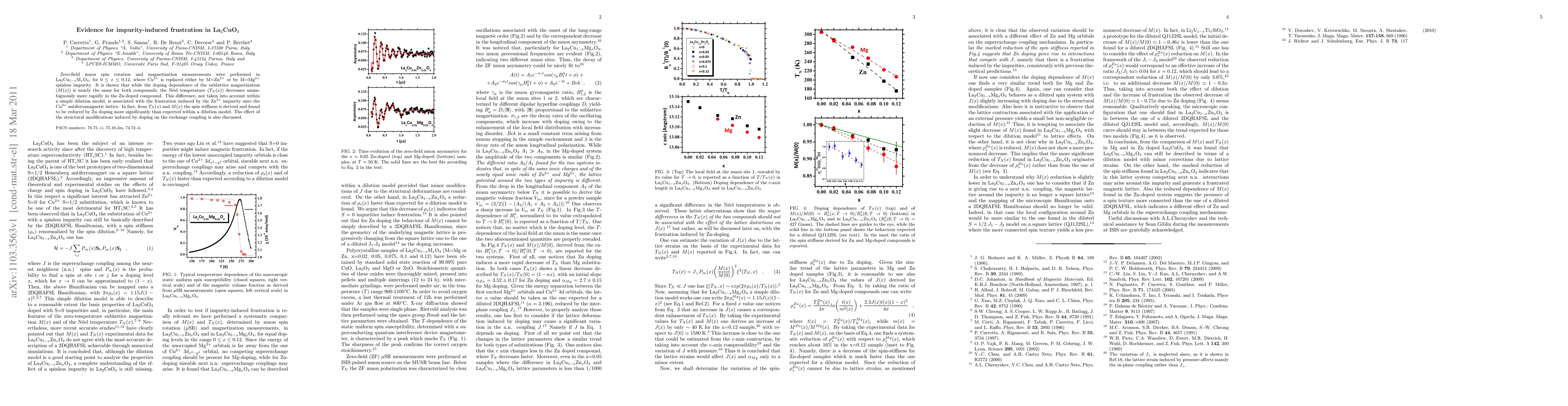 This study reveals impurity-induced frustration in La2CuO4 doped with Zn2+ or Mg2+ impurities, showing that Zn doping significantly reduces the Néel temperature and spin stiffness more than expected, indicating a stronger frustration effect compared to Mg doping.