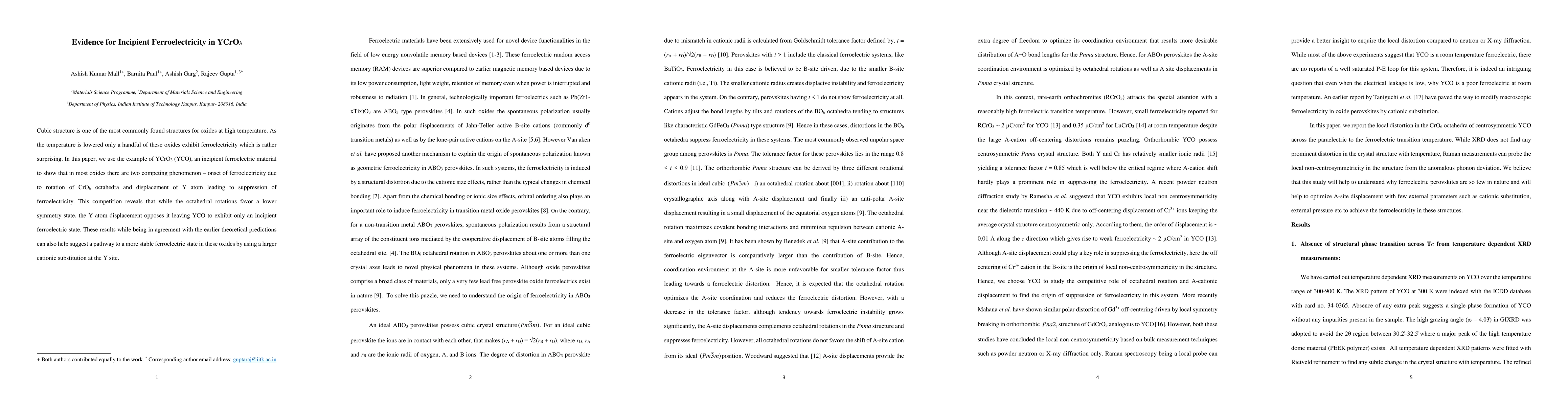 Cubic structure is one of the most commonly found structures for oxides at high temperature. As the temperature is lowered only a handful of these oxides exhibit ferroelectricity which is rather surprising. In this paper, we use the example of YCrO3 (YCO), an incipient ferroelectric material to show that in most oxides there are two competing phenomenon -onset of ferroelectricity due to rotation of CrO6 octahedra and displacement of Y atom leading to suppression of ferroelectricity. This competition reveals that while the octahedral rotations favor a lower symmetry state, the Y atom displacement opposes it leaving YCO to exhibit only an incipient ferroelectric state. These results while being in agreement with the earlier theoretical predictions can also help suggest a pathway to a more stable ferroelectric state in these oxides by using a larger cationic substitution at the Y site.