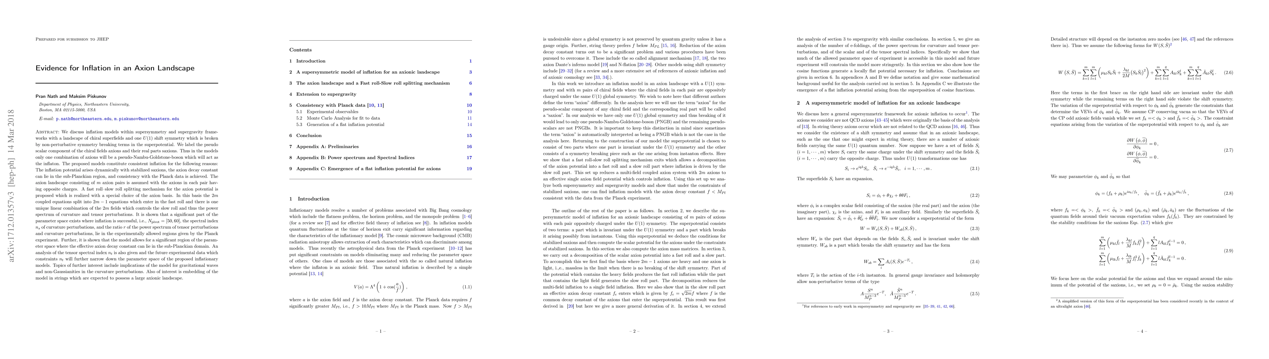 This paper proposes inflation models within supersymmetric and supergravity frameworks featuring a landscape of chiral superfields and a $U(1)$ symmetry breaking. It identifies a pseudo-Nambu-Goldstone-boson axion as the inflaton, demonstrating consistent inflation through dynamically stabilized saxions, sub-Planckian axion decay constants, and compatibility with Planck data.