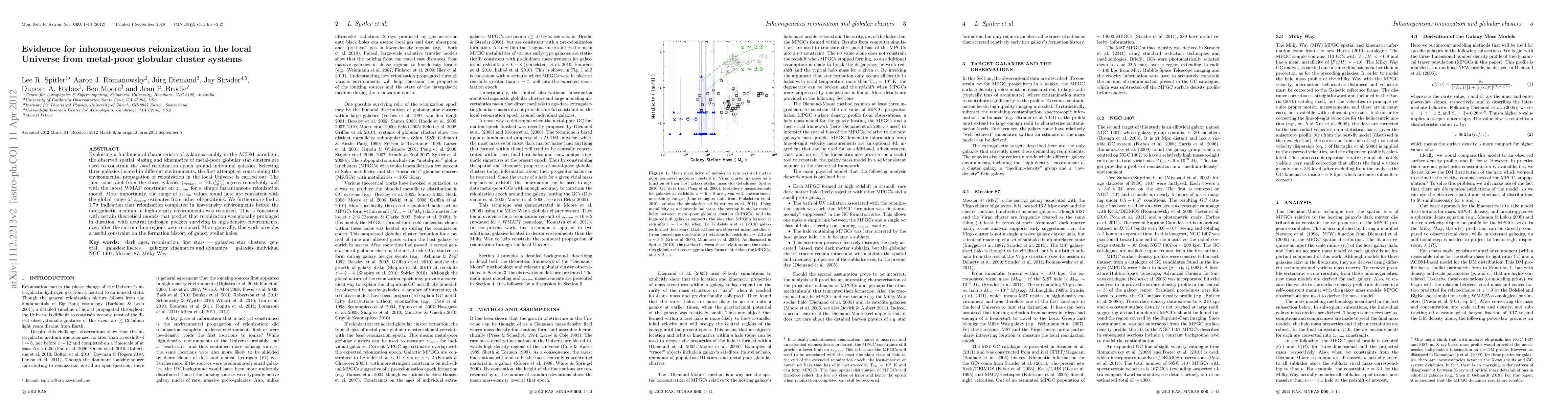 This paper uses the spatial biasing and kinematics of metal-poor globular clusters to constrain the local reionization epoch around three different galaxies, finding evidence for inhomogeneous reionization in the local Universe. The study suggests that reionization likely completed earlier in low-density environments compared to high-density ones, supporting prolonged global reionization models.
