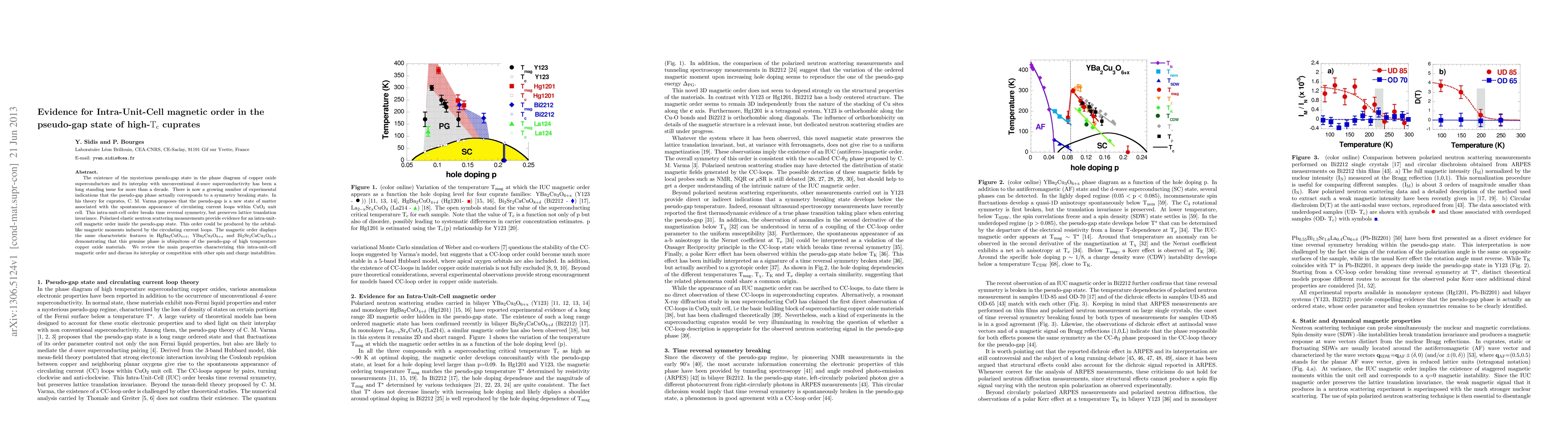 The existence of the mysterious pseudo-gap state in the phase diagram of copper oxide superconductors and its interplay with unconventional {\it d-wave} superconductivity has been a long standing issue for more than a decade. There is now a growing number of experimental indications that the pseudo-gap phase actually corresponds to a symmetry breaking state. In his theory for cuprates, C. M. Varma proposes that the pseudo-gap is a new state of matter associated with the spontaneous appearance of circulating current loops within $\rm CuO_2$ unit cell. This intra-unit-cell order breaks time reversal symmetry, but preserves lattice translation invariance. Polarized elastic neutron scattering measurements provide evidence for an intra-unit-cell magnetic order inside the pseudo-gap state. This order could be produced by the orbital-like magnetic moments induced by the circulating current loops. The magnetic order displays the same characteristic features in $\rm HgBa_2CuO_{4+\delta}$, $\rm YBa_2Cu_3O_{6+x}$ and $\rm Bi_2Sr_2CaCu_2O_{8+\delta}$ demonstrating that this genuine phase is ubiquitous of the pseudo-gap of high temperature copper oxide materials. We review the main properties characterizing this intra-unit-cell magnetic order and discuss its interplay or competition with other spin and charge instabilities.