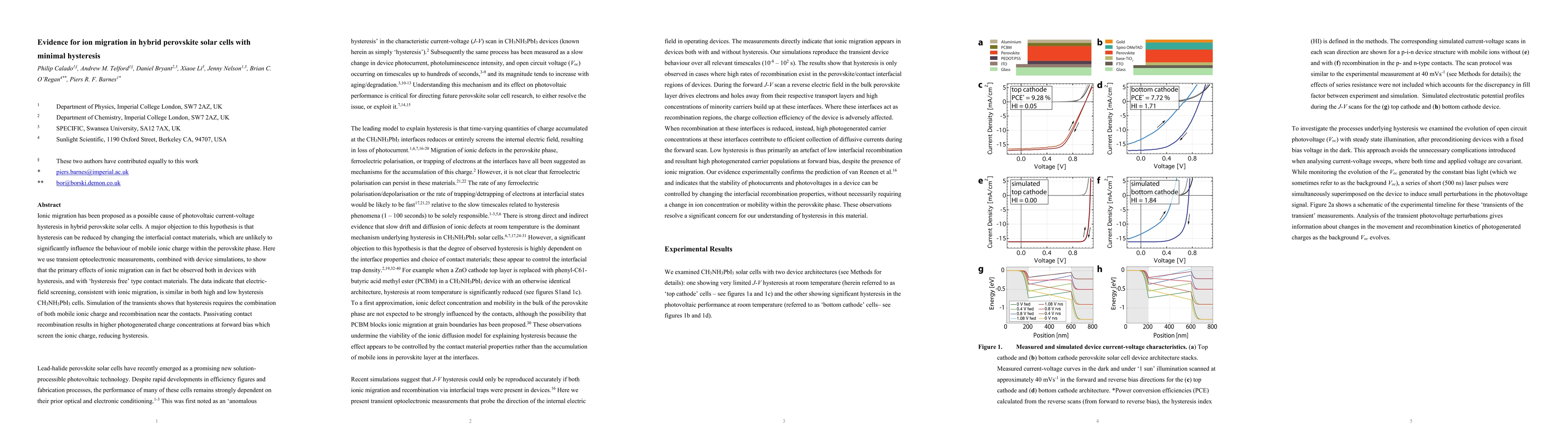 This paper demonstrates that ionic migration contributes to hysteresis in hybrid perovskite solar cells, regardless of the interfacial contact materials. The study shows that electric-field screening due to ionic migration is consistent across devices with varying levels of hysteresis, indicating that passivating contact recombination can reduce hysteresis by screening mobile ionic charge.