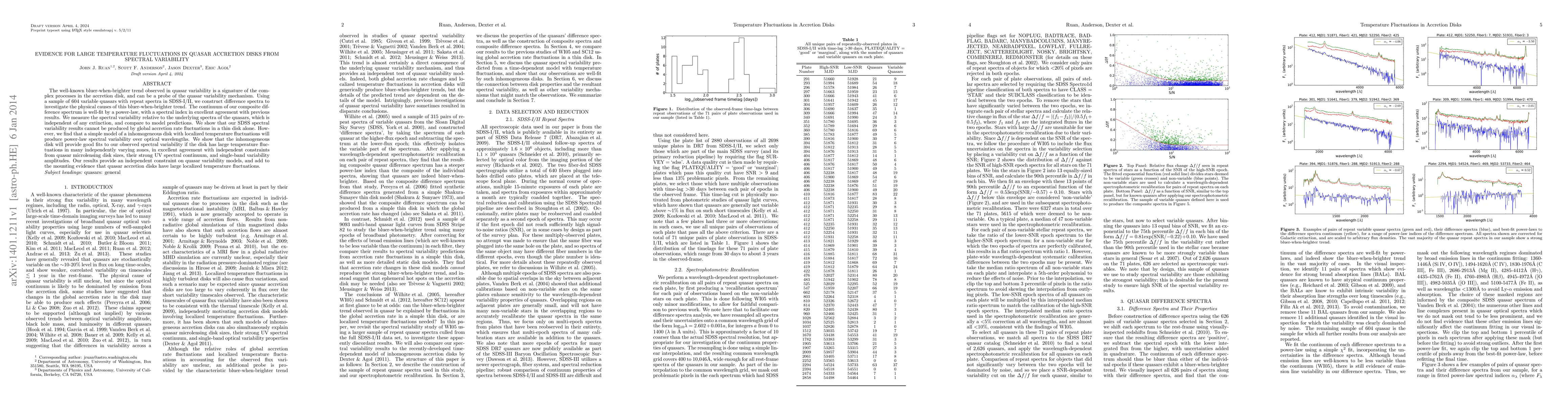 This study investigates the bluer-when-brighter trend in quasar variability using spectral data from SDSS-I/II, finding that it cannot be explained by global accretion rate fluctuations. Instead, it supports the presence of large localized temperature fluctuations in quasar accretion disks, as predicted by a model of inhomogeneous disk regions.