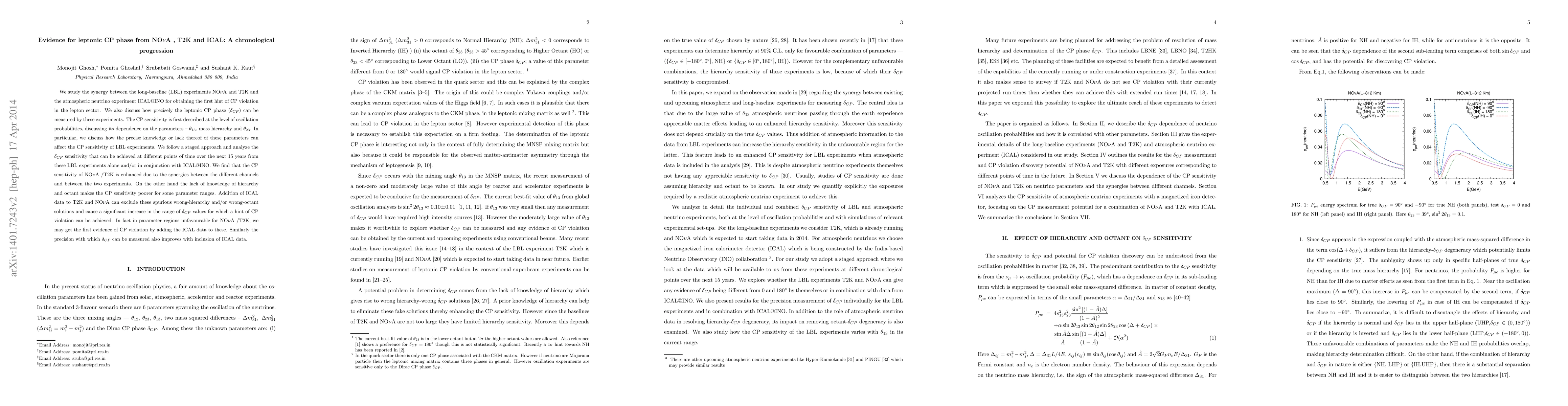 Long-baseline neutrino experiments NO$ u$A, T2K, and ICAL may provide the first hint of CP violation in the lepton sector within 15 years, with improved precision by adding ICAL data to T2K and NO$ u$A.