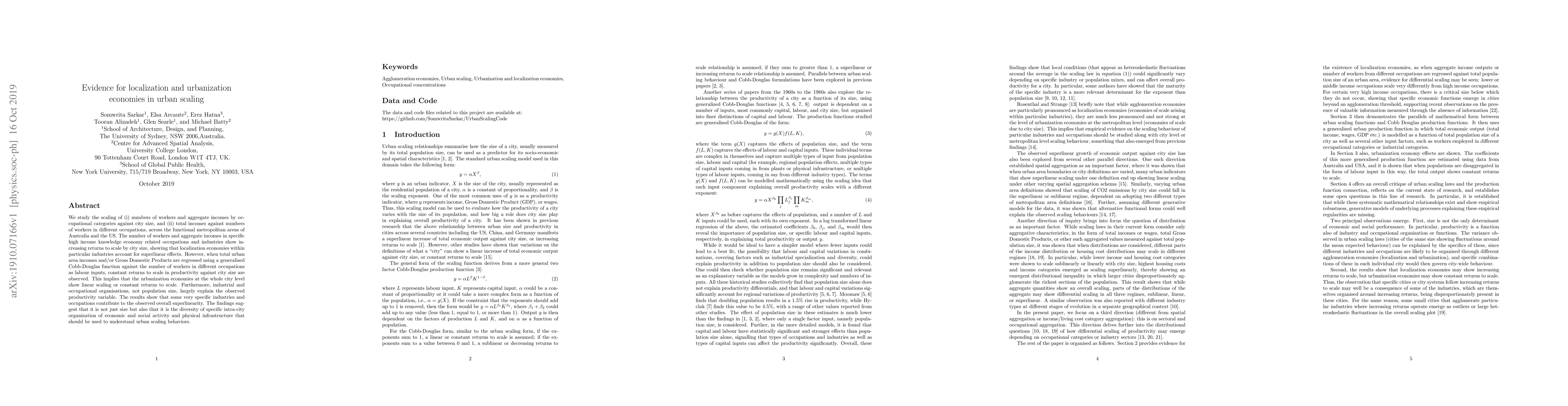 We study the scaling of (i) numbers of workers and aggregate incomes by occupational categories against city size, and (ii) total incomes against numbers of workers in different occupations, across the functional metropolitan areas of Australia and the US. The number of workers and aggregate incomes in specific high income knowledge economy related occupations and industries show increasing returns to scale by city size, showing that localization economies within particular industries account for superlinear effects. However, when total urban area incomes and/or Gross Domestic Products are regressed using a generalised Cobb-Douglas function against the number of workers in different occupations as labour inputs, constant returns to scale in productivity against city size are observed. This implies that the urbanization economies at the whole city level show linear scaling or constant returns to scale. Furthermore, industrial and occupational organisations, not population size, largely explain the observed productivity variable. The results show that some very specific industries and occupations contribute to the observed overall superlinearity. The findings suggest that it is not just size but also that it is the diversity of specific intra-city organization of economic and social activity and physical infrastructure that should be used to understand urban scaling behaviors.