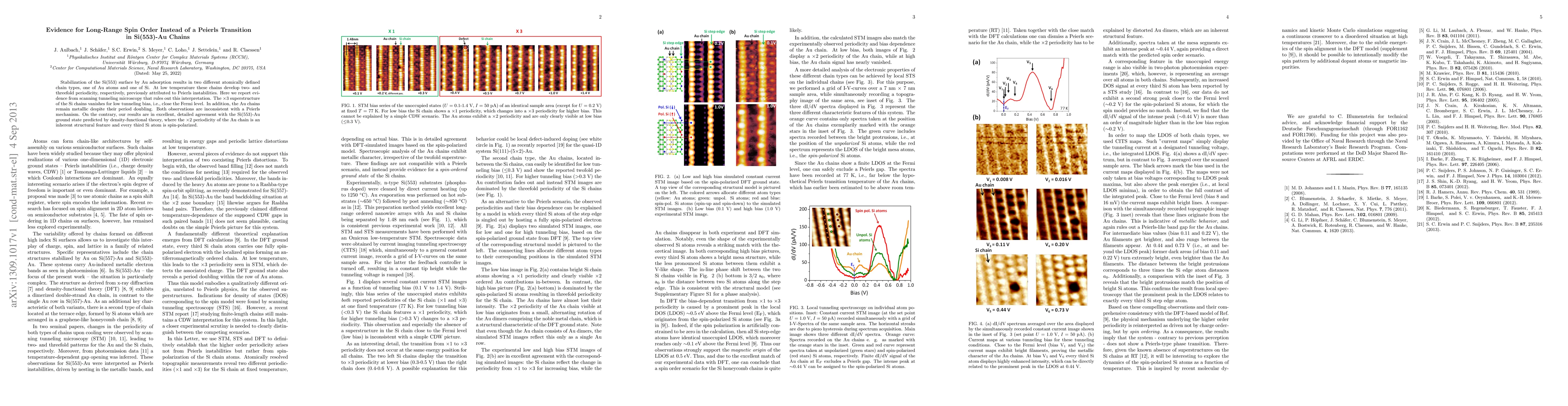 The Si(553) surface stabilized by Au adsorption forms Au and Si chains that develop period doubling at low temperatures, previously linked to Peierls transitions. However, scanning tunneling microscopy evidence indicates that the Si chains' x3 superstructure vanishes near the Fermi level, and Au chains remain metallic, refuting a Peierls mechanism in favor of long-range spin order in the Si atoms.