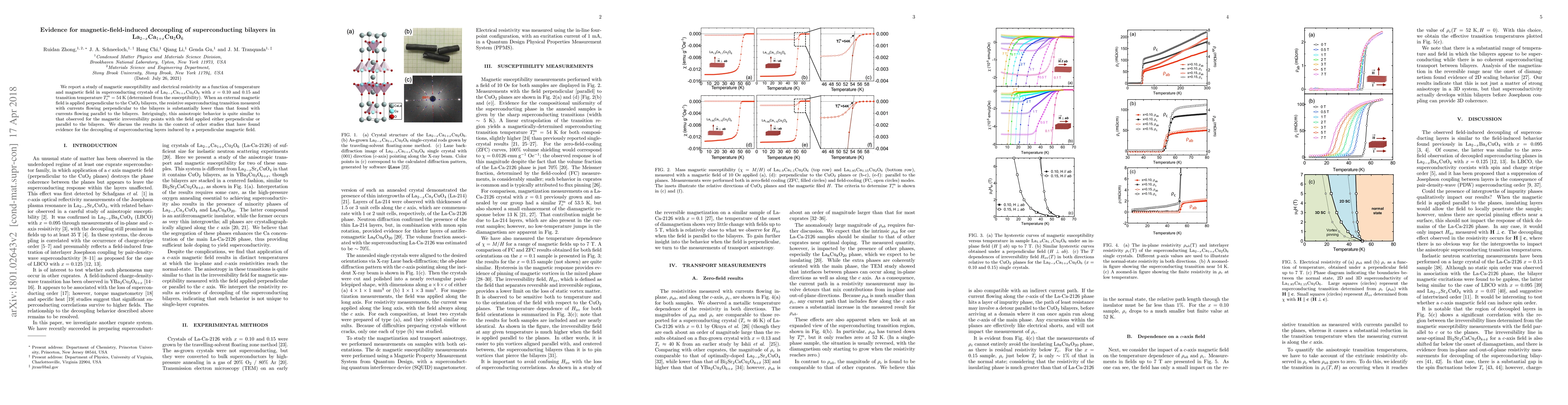 The paper presents detailed measurements and analysis of magnetic susceptibility and electrical resistivity in La$_{2-x}$Ca$_{1+x}$Cu$_{2}$O$_{6}$, revealing anisotropic behavior under applied magnetic fields and supporting the concept of magnetic-field-induced decoupling of superconducting layers.