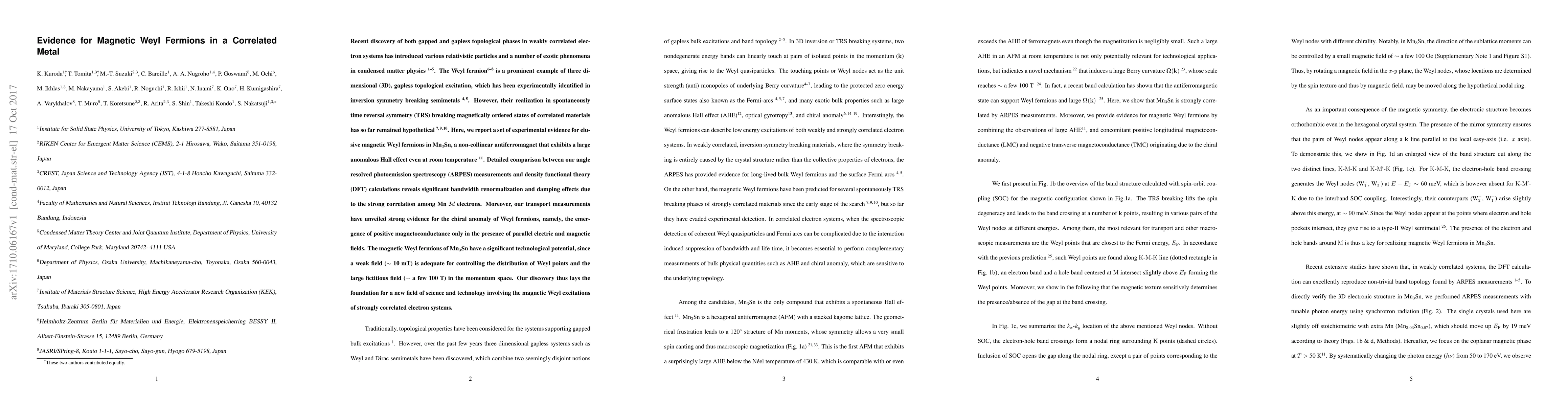 This paper reports experimental evidence for the existence of magnetic Weyl fermions in the correlated metal Mn$_3$Sn, observed through angle-resolved photoemission spectroscopy and transport measurements. The study highlights significant renormalization and damping effects due to strong electron correlations, and the discovery holds technological promise for controlling Weyl points with weak magnetic fields.