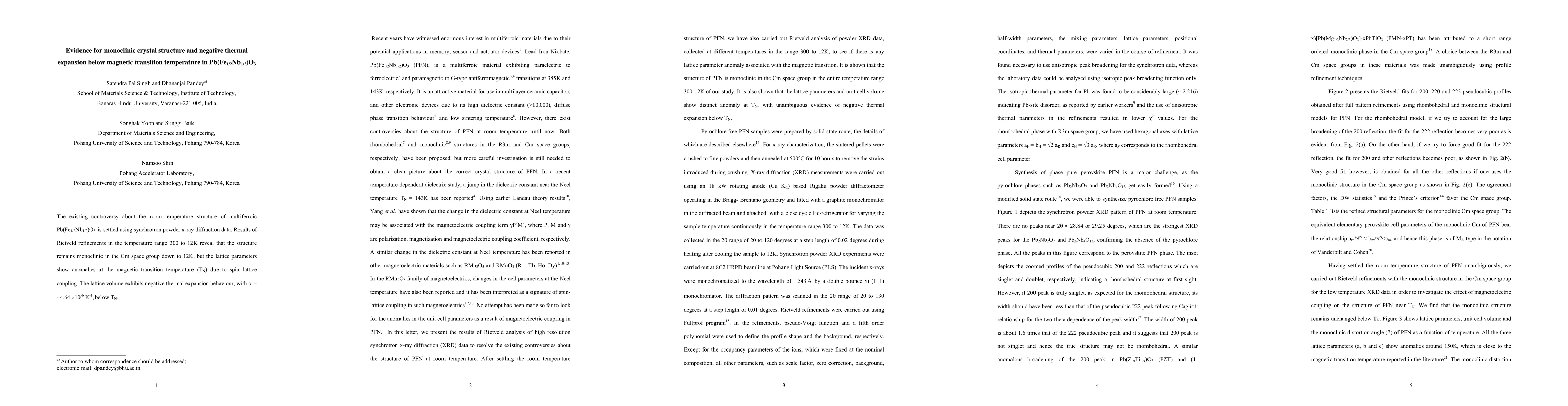 The existing controversy about the room temperature structure of multiferroic Pb(Fe_1/2Nb_1/2)O_3 is settled using synchrotron powder x-ray diffraction data. Results of Rietveld refinements in the temperature range 300 to 12K reveal that the structure remains monoclinic in the Cm space group down to 12K, but the lattice parameters show anomalies at the magnetic transition temperature (T_N) due to spin lattice coupling. The lattice volume exhibits negative thermal expansion behaviour, with Alpha = - 4.64 x 10^-6 K^-1, below T_N.