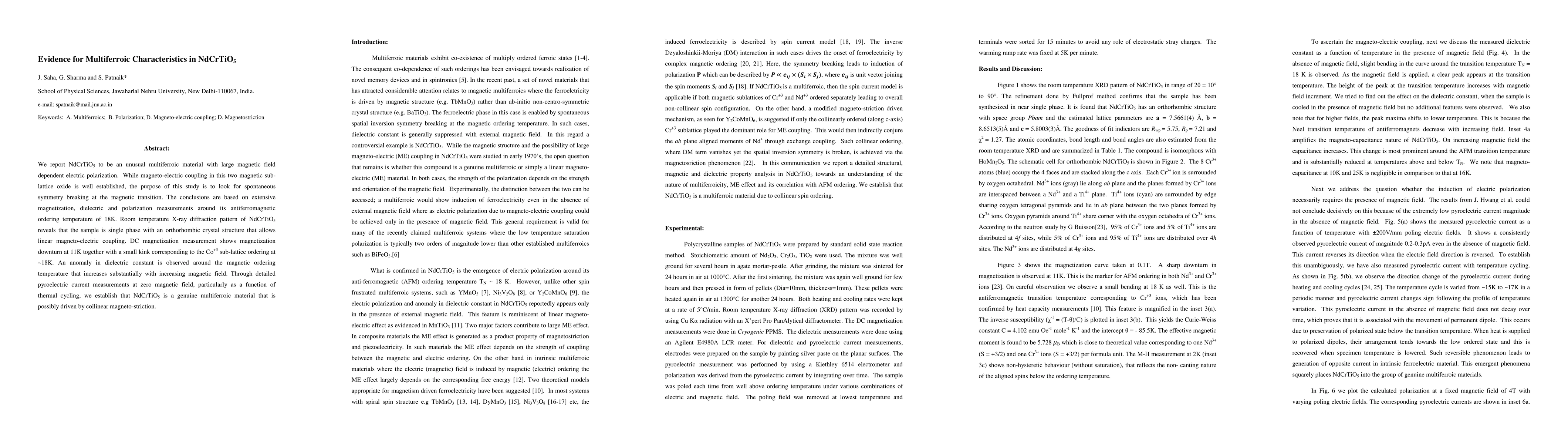 We report NdCrTiO5 to be an unusual multiferroic material with large magnetic field dependent electric polarization. While magneto-electric coupling in this two magnetic sub-lattice oxide is well established, the purpose of this study is to look for spontaneous symmetry breaking at the magnetic transition. The conclusions are based on extensive magnetization, dielectric and polarization measurements around its antiferromagnetic ordering temperature of 18K. Room temperature X-ray diffraction pattern of NdCrTiO5 reveals that the sample is single phase with an orthorhombic crystal structure that allows linear magneto-electric coupling. DC magnetization measurement shows magnetization downturn at 11K together with a small kink corresponding to the Co+3 sub-lattice ordering at ~18K. An anomaly in dielectric constant is observed around the magnetic ordering temperature that increases substantially with increasing magnetic field. Through detailed pyroelectric current measurements at zero magnetic field, particularly as a function of thermal cycling, we establish that NdCrTiO5 is a genuine multiferroic material that is possibly driven by collinear magneto-striction.