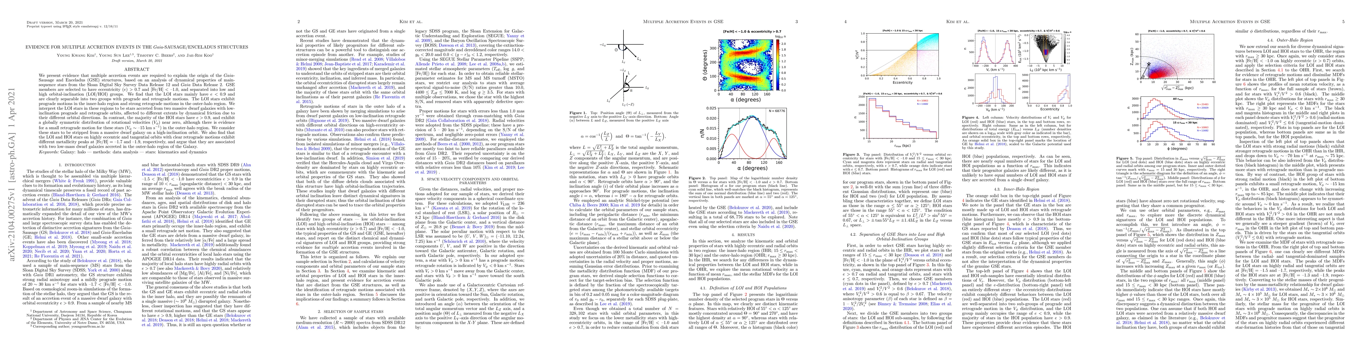 We present evidence that multiple accretion events are required to explain the origin of the $Gaia$-Sausage and Enceladus (GSE) structures, based on an analysis of dynamical properties of main-sequence stars from the Sloan Digital Sky Survey Data Release 12 and $Gaia$ Data Release 2. GSE members are selected to have eccentricity ($e$) $>$ 0.7 and [Fe/H] $<$ -1.0, and separated into low and high orbital-inclination (LOI/HOI) groups. We find that the LOI stars mainly have $e < 0.9$ and are clearly separable into two groups with prograde and retrograde motions. The LOI stars exhibit prograde motions in the inner-halo region and strong retrograde motions in the outer-halo region. We interpret the LOI stars in these regions to be stars accreted from two massive dwarf galaxies with low-inclination prograde and retrograde orbits, affected to different extents by dynamical friction due to their different orbital directions. In contrast, the majority of the HOI stars have $e > 0.9$, and exhibit a globally symmetric distribution of rotational velocities ($V_{\rm \phi}$) near zero, although there is evidence for a small retrograde motion for these stars ($V_{\rm \phi}$ $\sim$ -15 $\rm{km~s^{-1}}$) in the outer-halo region. We consider these stars to be stripped from a massive dwarf galaxy on a high-inclination orbit. We also find that the LOI and HOI stars on highly eccentric and tangential orbits with clear retrograde motions exhibit different metallicity peaks at [Fe/H] = -1.7 and -1.9, respectively, and argue that they are associated with two low-mass dwarf galaxies accreted in the outer-halo region of the Galaxy.