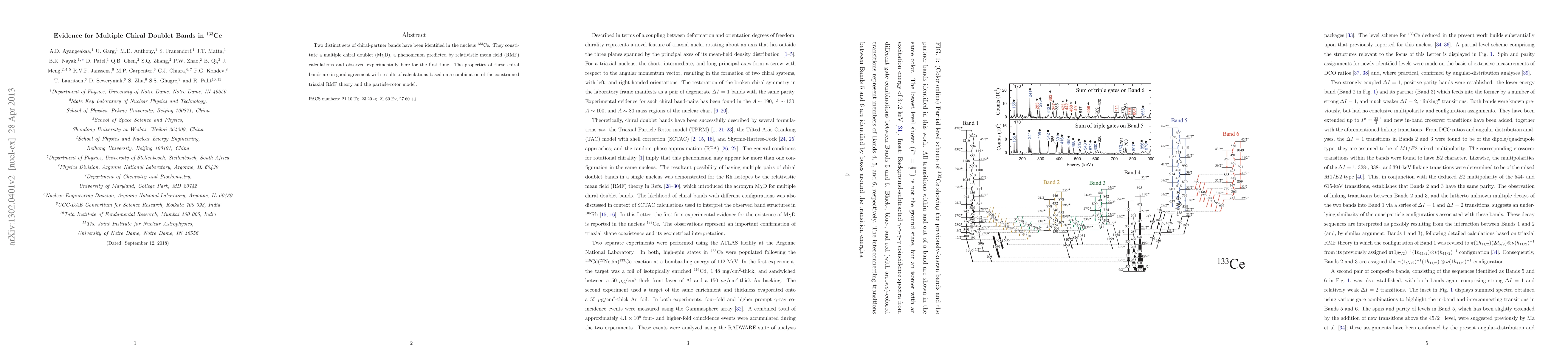 Summary: This research identifies two distinct chiral-partner bands in $^{133}$Ce, forming the first experimental observation of a multiple chiral doublet (M$\chi$D), a phenomenon predicted by relativistic mean field calculations. The findings align well with theoretical predictions from constrained triaxial RMF and the particle-rotor model.