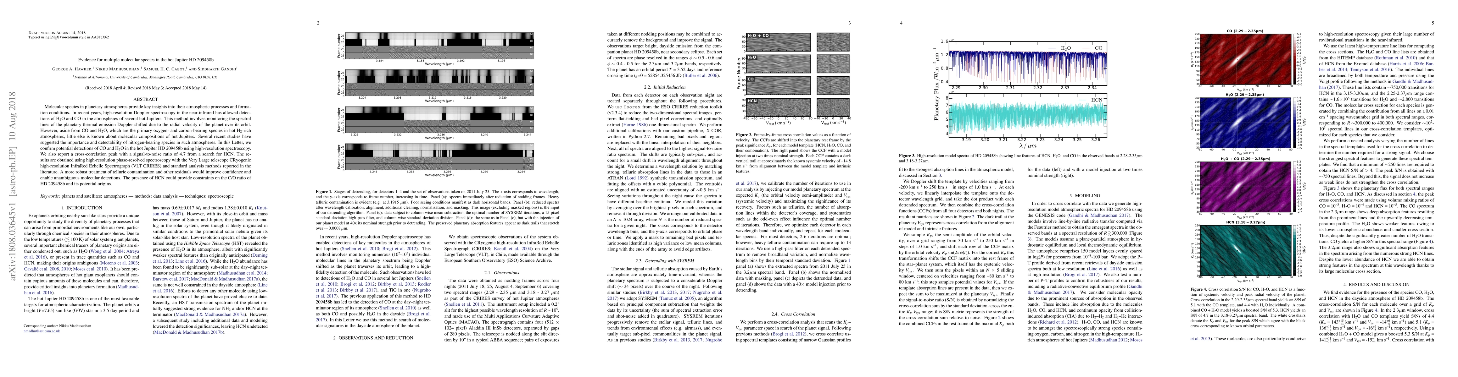 This research confirms the detection of CO and H$_2$O in the atmosphere of the hot Jupiter HD 209458b using high-resolution spectroscopy and suggests the potential presence of HCN, which could help determine the planet's C/O ratio and formation conditions. Further analysis is needed to confirm the HCN detection and improve atmospheric understanding.