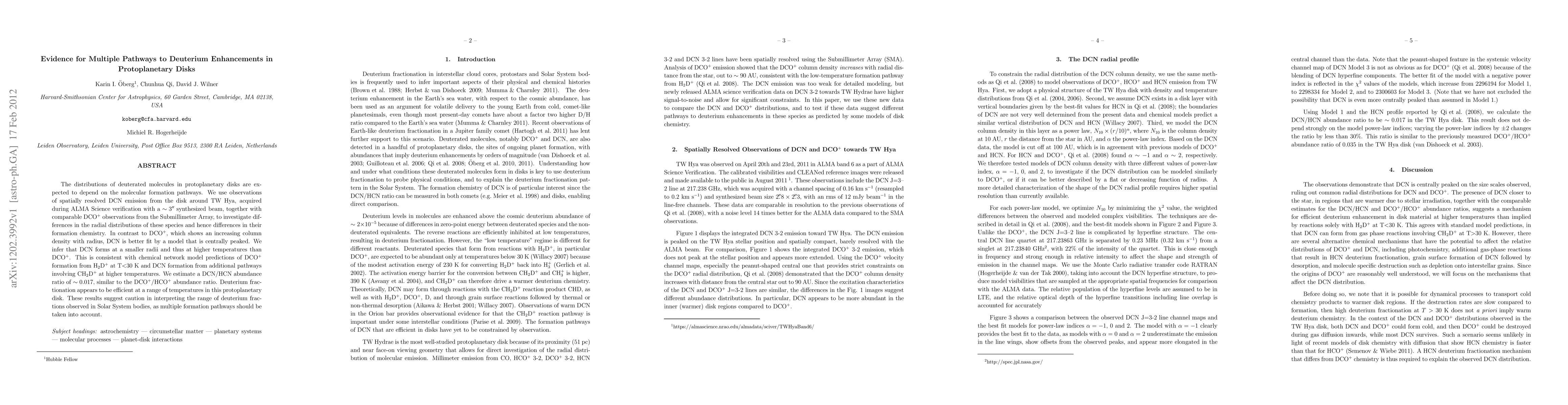 This paper investigates the radial distribution of deuterated molecules in the protoplanetary disk around TW Hya, finding that DCN forms at smaller radii and higher temperatures compared to DCO+. This suggests multiple pathways for deuterium enhancement, cautioning interpretations of deuterium fractions in Solar System bodies.