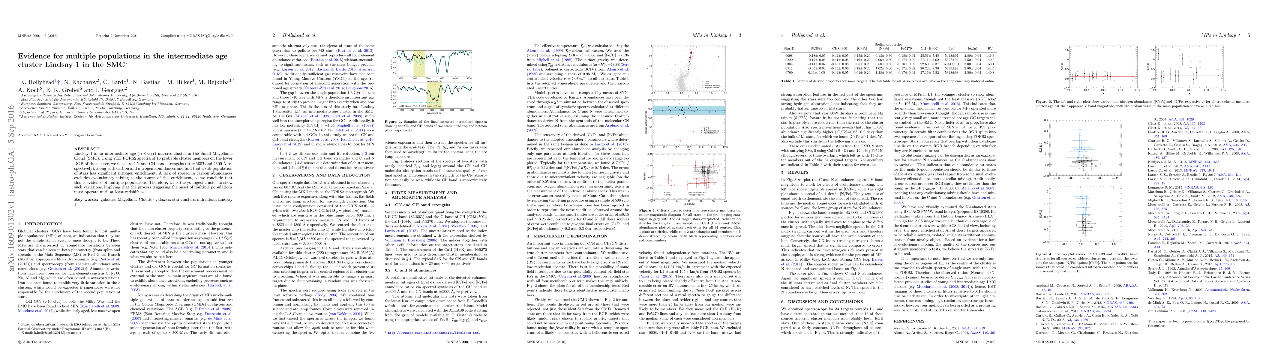 Lindsay 1 is an intermediate age (approx 8 Gyr) massive cluster in the Small Magellanic Cloud (SMC). Using VLT FORS2 spectra of 16 probable cluster members on the lower RGB of the cluster, we measure CN and CH band strengths (at 3883 and 4300 Angstroms respectively), along with carbon and nitrogen abundances and find that a sub-population of stars has significant nitrogen enrichment. A lack of spread in carbon abundances excludes evolutionary mixing as the source of this enrichment, so we conclude that this is evidence of multiple populations. Therefore, L1 is the youngest cluster to show such variations, implying that the process triggering the onset of multiple populations must operate until at least redshift ~1.