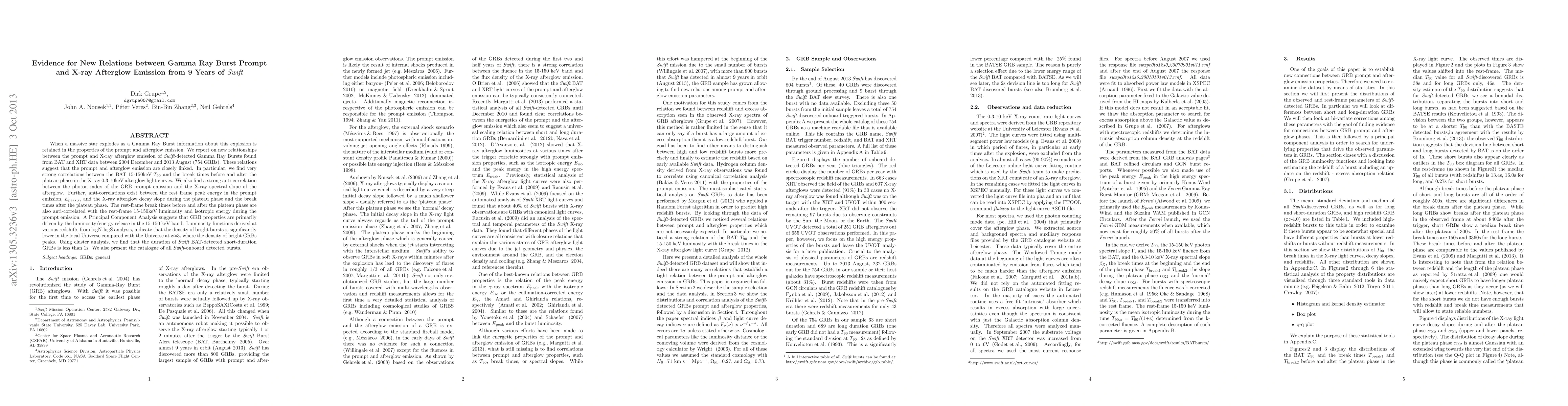 When a massive star explodes as a Gamma Ray Burst information about this explosion is retained in the properties of the prompt and afterglow emission. We report on new relationships between the prompt and X-ray afterglow emission of Swift-detected Gamma Ray Bursts found from BAT and XRT data between 2004 December and 2013 August (754 GRBs). These relations suggest that the prompt and afterglow emission are closely linked. In particular,we find very strong correlations between the BAT 15-150keV $T_{90}$ and the break times before and after the plateau phase in the X-ray 0.3-10keV afterglow light curves. We also find a strong anti-correlation between the photon index of the GRB prompt emission and the X-ray spectral slope of the afterglow. Further, anti-correlations exist between the rest frame peak energy in the prompt emission, E-peak,z, and the X-ray afterglow decay slope during the plateau phase and the break times after the plateau phase. The rest-frame break times before and after the plateau phase are also anti-correlated with the rest-frame 15-150keV luminosity and isotropic energy during the prompt emission. A Principal Component Analysis suggests that GRB properties are primarily driven by the luminosity/energy release in the 15-150 keV band. Luminosity functions derived at various redshifts from logN-logS analysis, indicate that the density of bright bursts is significantly lower in the local Universe compared with the Universeat z$\approx$3, where the density of bright GRBs peaks. Using cluster analysis, we find that the duration of Swift BAT-detected short-duration GRBs is less than 1s. We also present the catalogue of all \swift-onboard detected bursts.