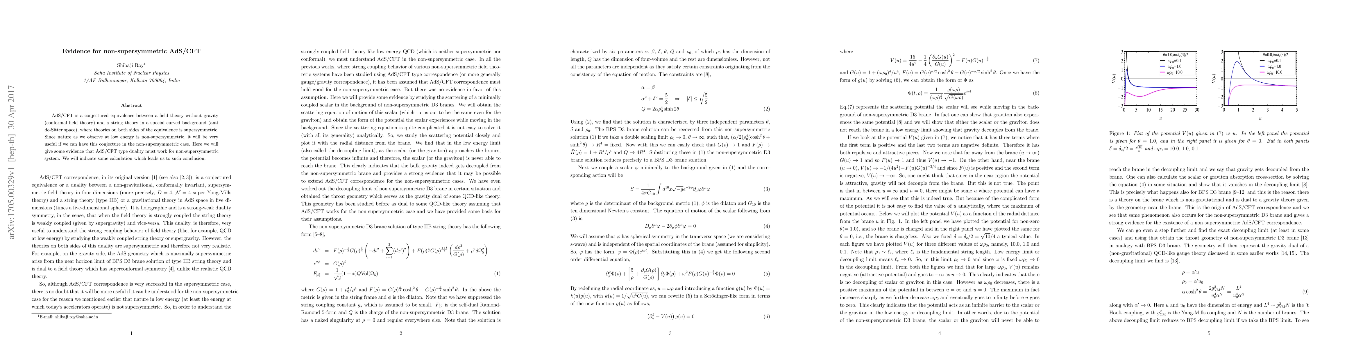 AdS/CFT is a conjectured equivalence between a field theory without gravity (conformal field theory) and a string theory in a special curved background (anti de-Sitter space), where theories on both sides of the equivalence is supersymmetric. Since the nature as we observe at low energy is non-supersymmetric, it will be very useful if we can have this conjecture in the non-supersymmetric case. Here we will give some evidence that AdS/CFT type duality must work for non-supersymmetric system. We will indicate some calculation which leads us to such conclusion.
