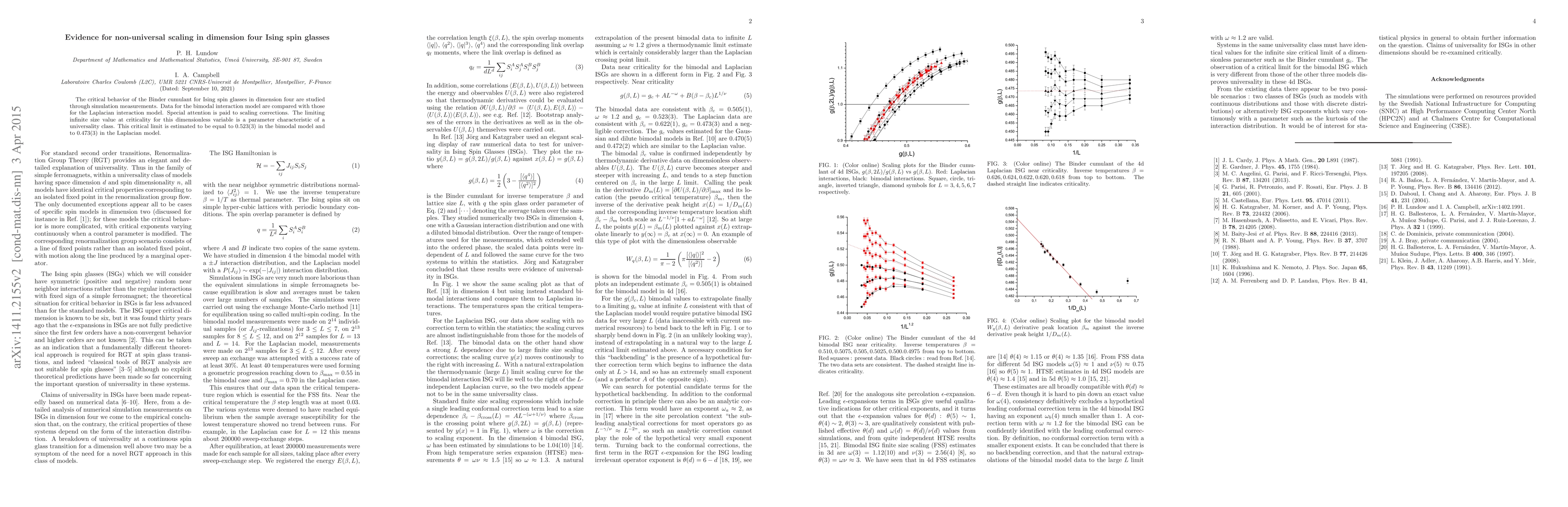 This paper investigates the critical behavior of Ising spin glasses in four dimensions, finding non-universal scaling in the Binder cumulant. The bimodal interaction model yields a critical limit of $0.523(3)$, while the Laplacian model gives a different limit of $0.473(3)$, indicating distinct universality classes.