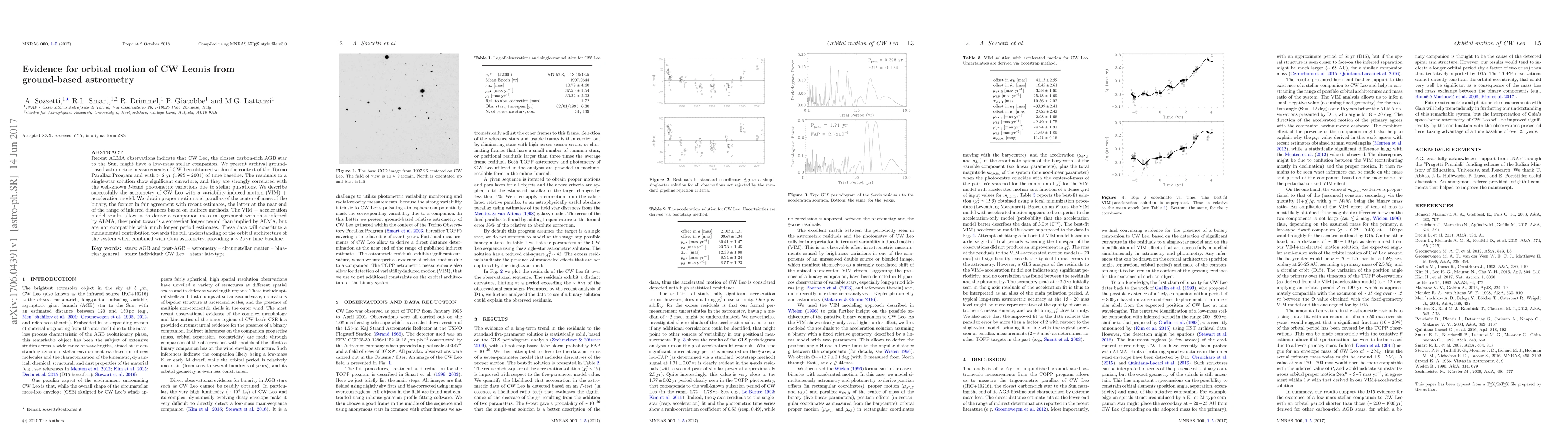 Ground-based astrometry measurements reveal a low-mass stellar companion to CW Leo, an AGB star with pulsation-induced variability, supporting a binary system with a near solar distance.
